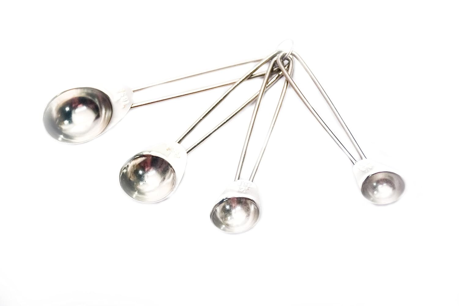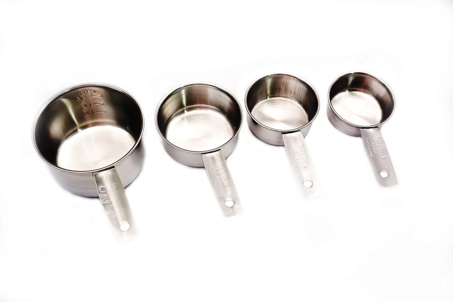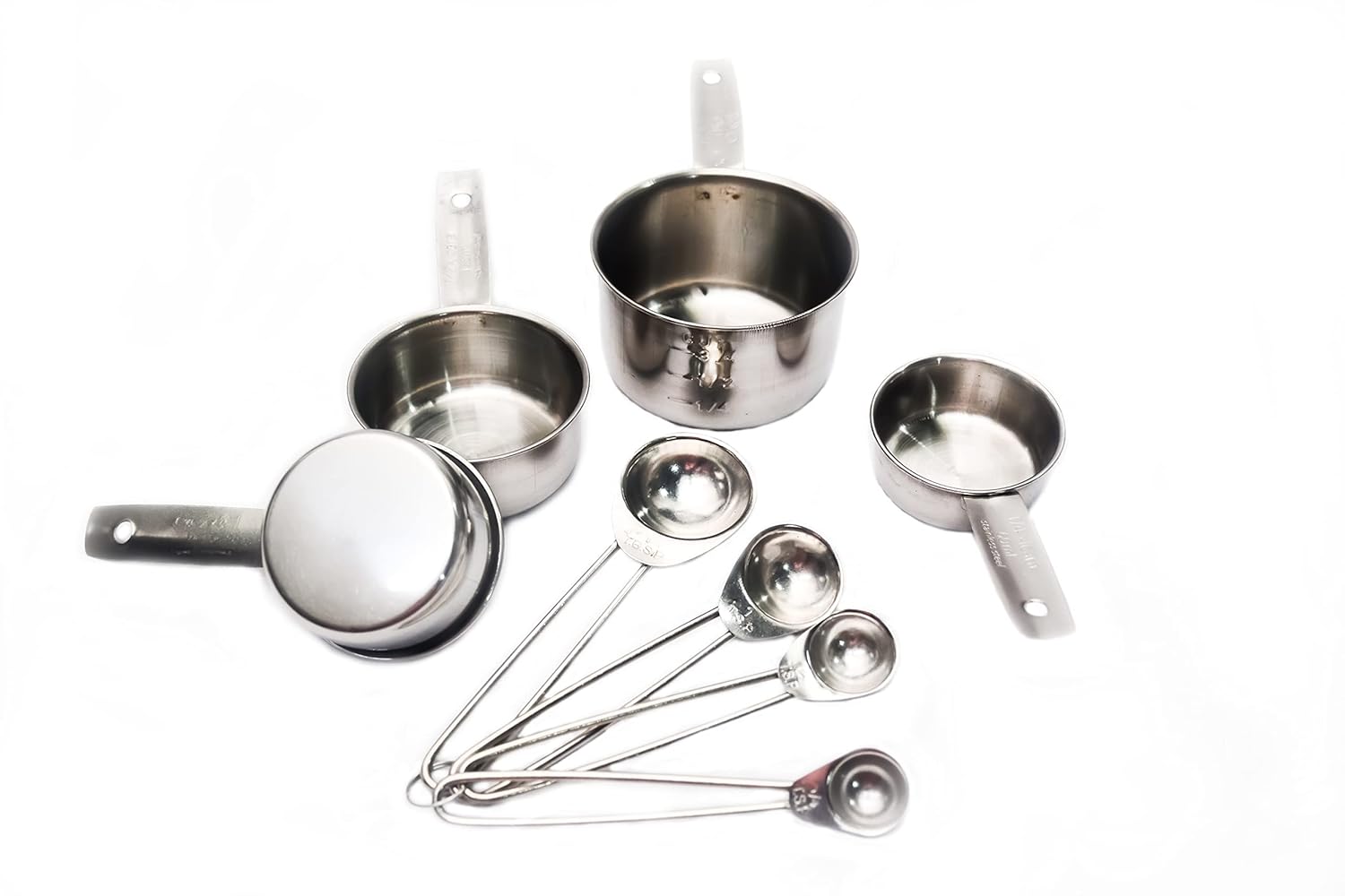 COMPLETE 4 PCS CUPSET of supreme quality and sturdy stainless steel measuring cups, including 60ML (1/4Cup), 80ML (1/3Cup), 125ML (1/2Cup) and 250ML (1Cup) and COMPLETE 4 PCS Measuring Spoon Set of high quality and sturdy stainless steel measuring spoons with ring , includes: 1/4 TSP(1.25 ml), 1/2 TSP(2.5 ml.) , 1 (5 ml.) teaspoon, and 1 (15 ml.) tablespoon.