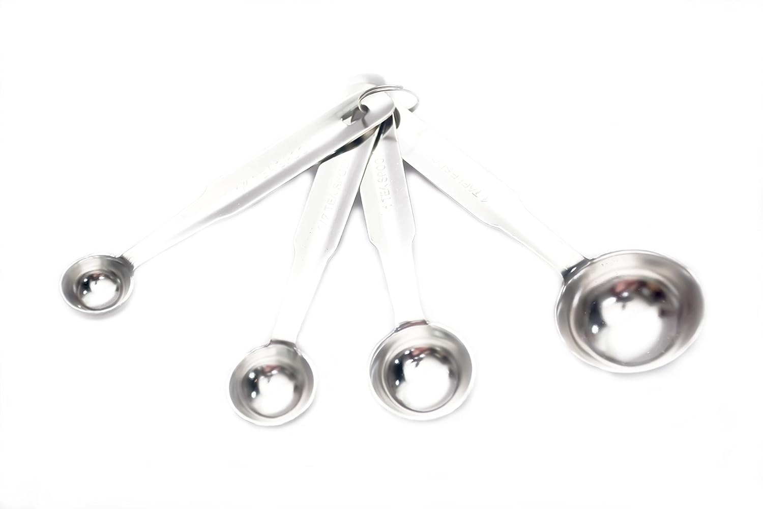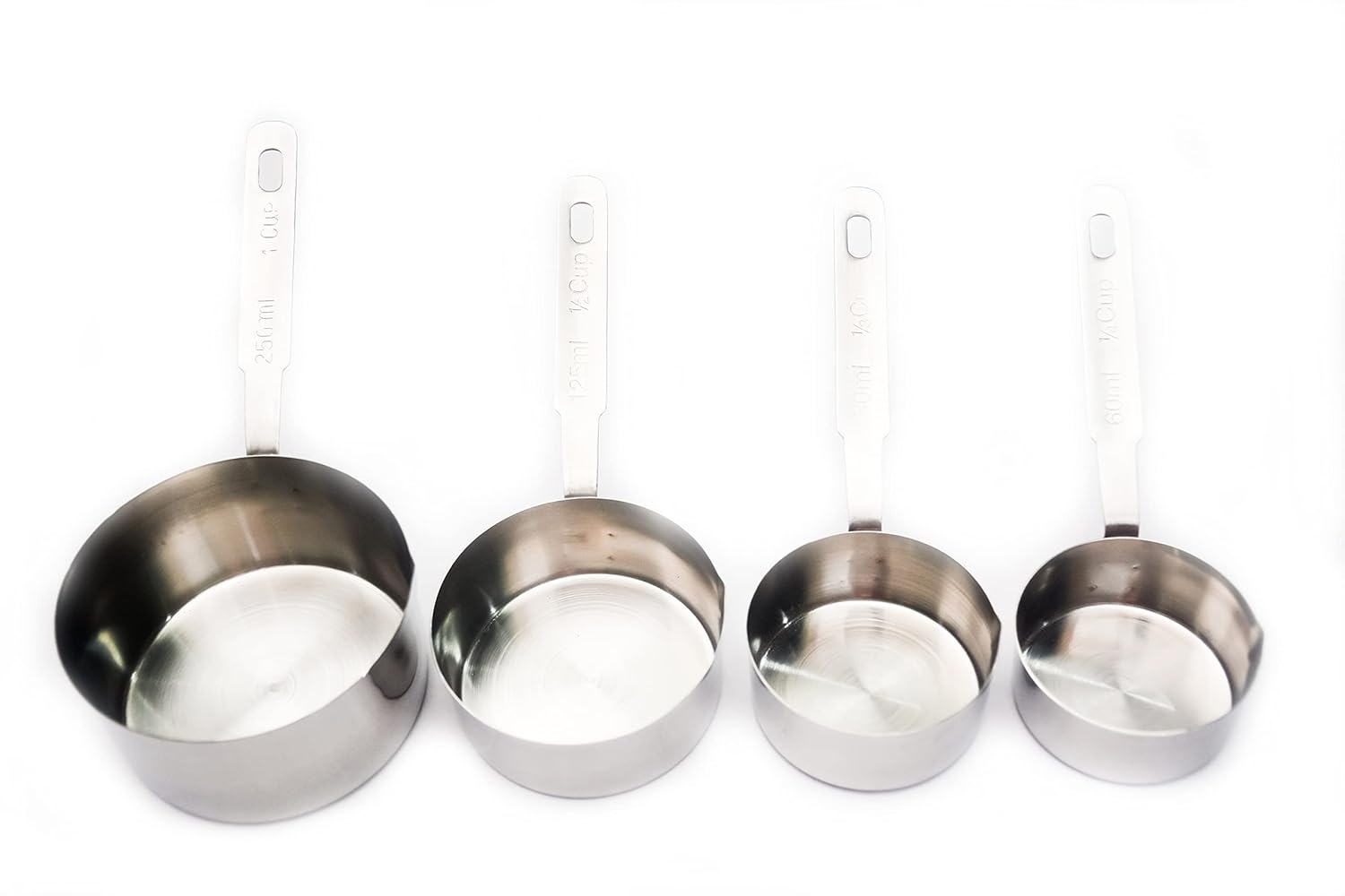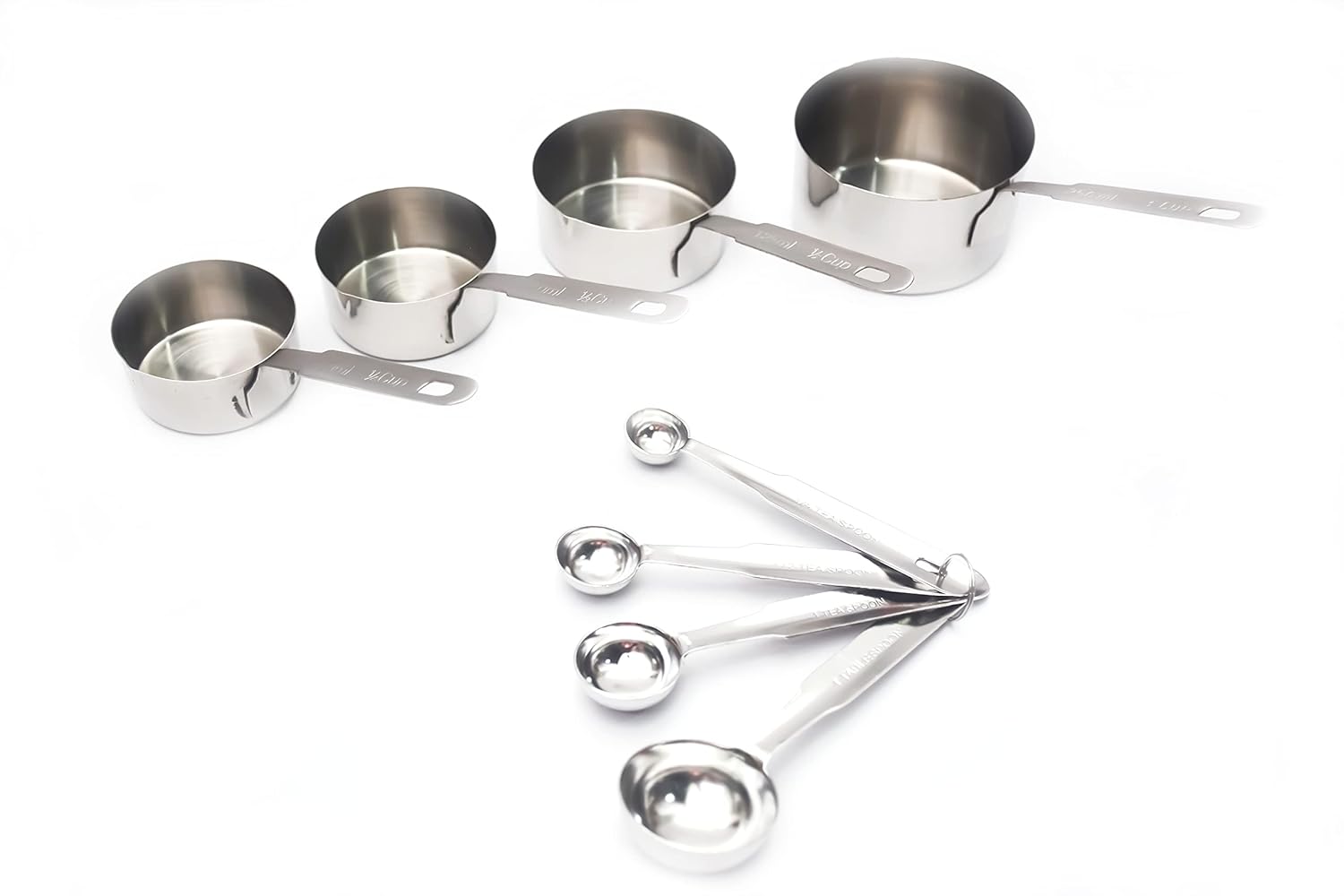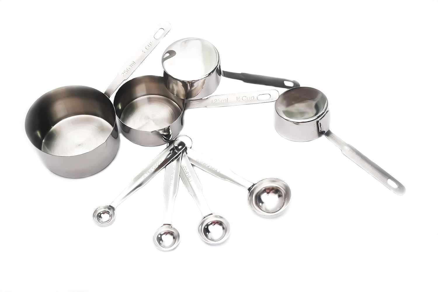 COMPLETE 4 PCS CUPSET of supreme quality and sturdy stainless steel measuring cups, including 60ML (1/4Cup), 80ML (1/3Cup), 125ML (1/2Cup) and 250ML (1Cup) and COMPLETE 4 PCS Measuring Spoon Set of high quality and sturdy stainless steel measuring spoons with ring , includes: 1/4 TSP(1.25 ml), 1/2 TSP(2.5 ml.) , 1 (5 ml.) teaspoon, and 1 (15 ml.) tablespoon.