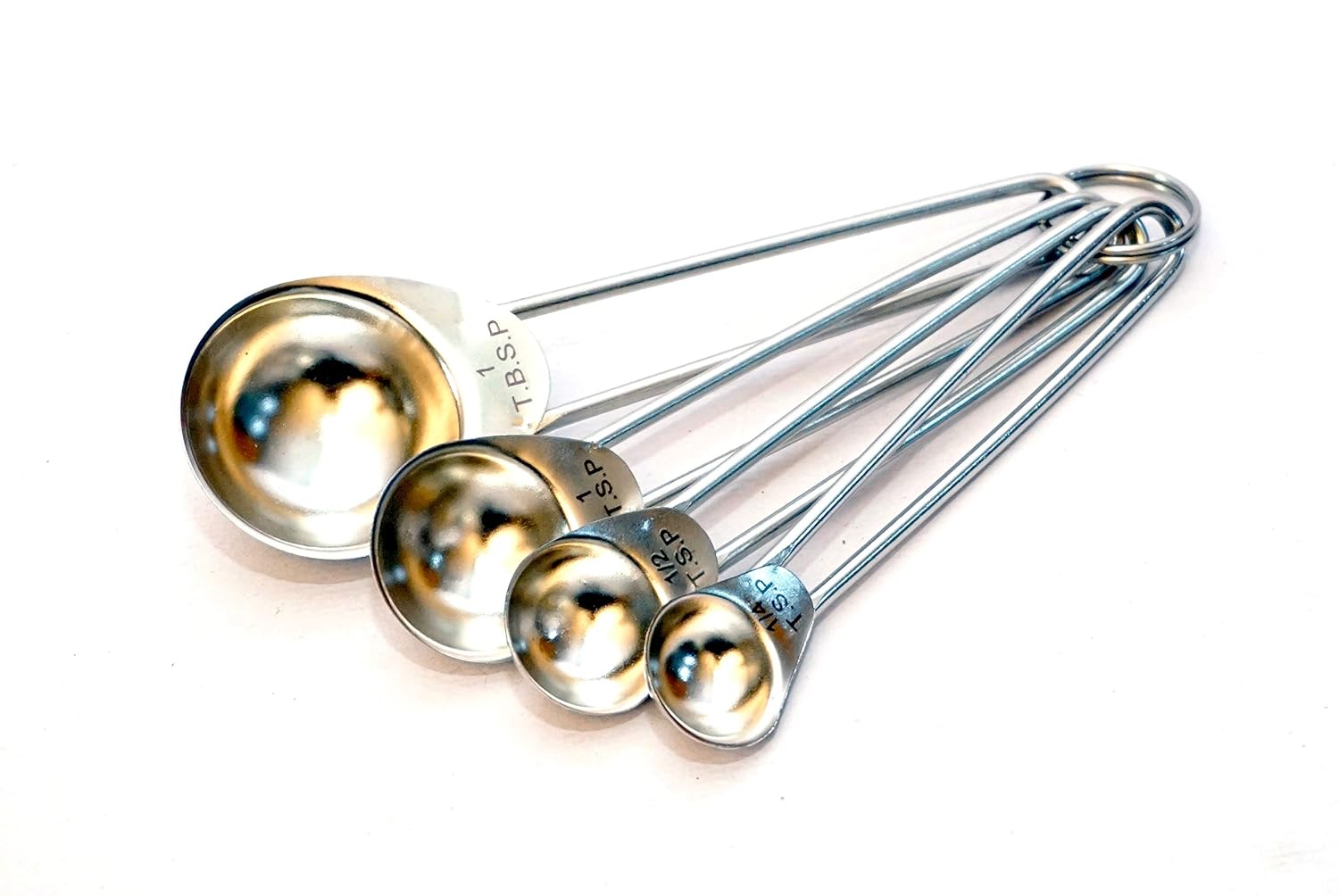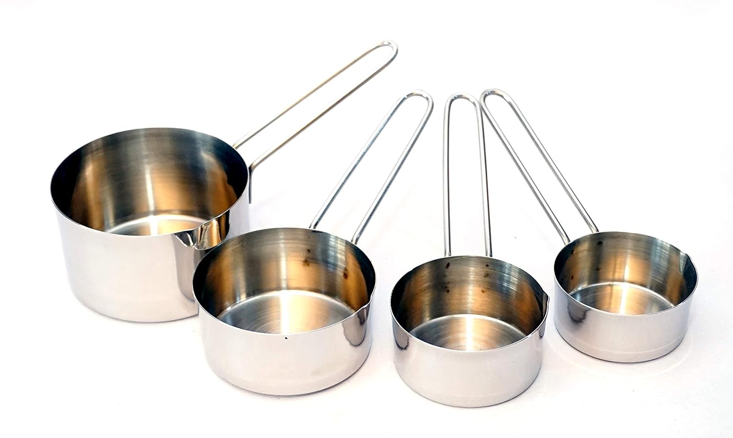 COMPLETE 4 PCS CUPSET of supreme quality and sturdy stainless steel measuring cups, including 60ML (1/4Cup), 80ML (1/3Cup), 125ML (1/2Cup) and 250ML (1Cup) and COMPLETE 4 PCS Measuring Spoon Set of high quality and sturdy stainless steel measuring spoons with ring , includes: 1/4 TSP(1.25 ml), 1/2 TSP(2.5 ml.) , 1 (5 ml.) teaspoon, and 1 (15 ml.) tablespoon.