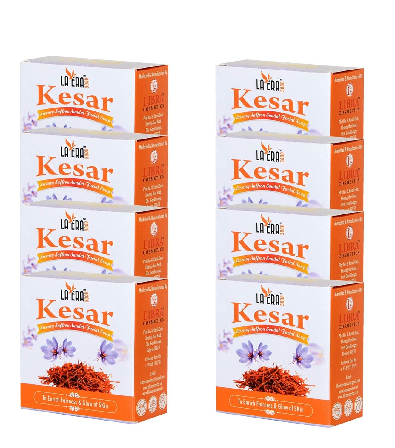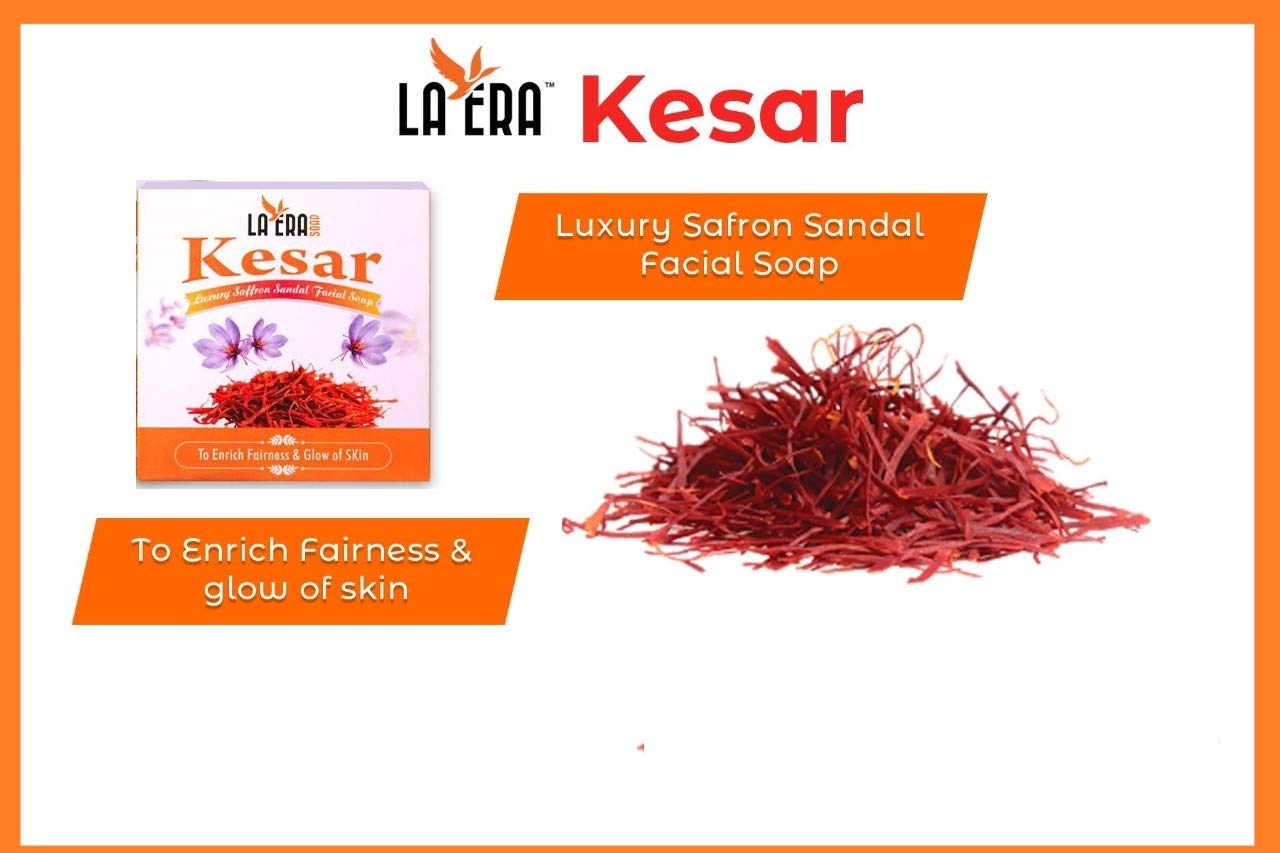 LA ERA KESAR SOAP is a excellent natural ingredient for reducing pigmentation, brown spots and other skin blemishes. LA ERA kesar luxury soap has myriad of beauty benefit.apart from kesar this luxury soap contains sandal ,camphor ,silicon oil and glycerine. This age-old combination of Kesar & Chandan, effectively exfoliates dead skin cells from the surface. It even fights tanning; fades dark spots and blemishes; and lightens the overall tone of the skin. Saffron is an excellent skin toning agent. It helps in eliminating the blackheads and unclogs the clogged pores. Saffron also scavenges the free radicals and promotes better circulation to the face, thereby ensuring that the skin looks toned and firm. Helps in curing acne: Saffron and sandal has amazing antimicrobial or antibacterial qualities, which impart medicinal values in it. Moreover, it also holds excellent exfoliating capacity. Both of these are necessary for clearing up the skin and curing acne. Reduces skin pigmentation: There is no other natural ingredient that can reduce pigmentation and other skin blemishes as effectively as saffron. It is the exfoliating property of the spice, which sloughs off the layer of the dead cells (along with dirt and grime) and reveals a pigmentation-free clear skin. Gives you a fair skin: Packed with various vitamins such as A, C, and the B vitamins, saffron is known to possess skin lightening properties. Saffron contains antioxidant Quercitin, which reduces production of Melanin pigment thus helps in providing fairness. :