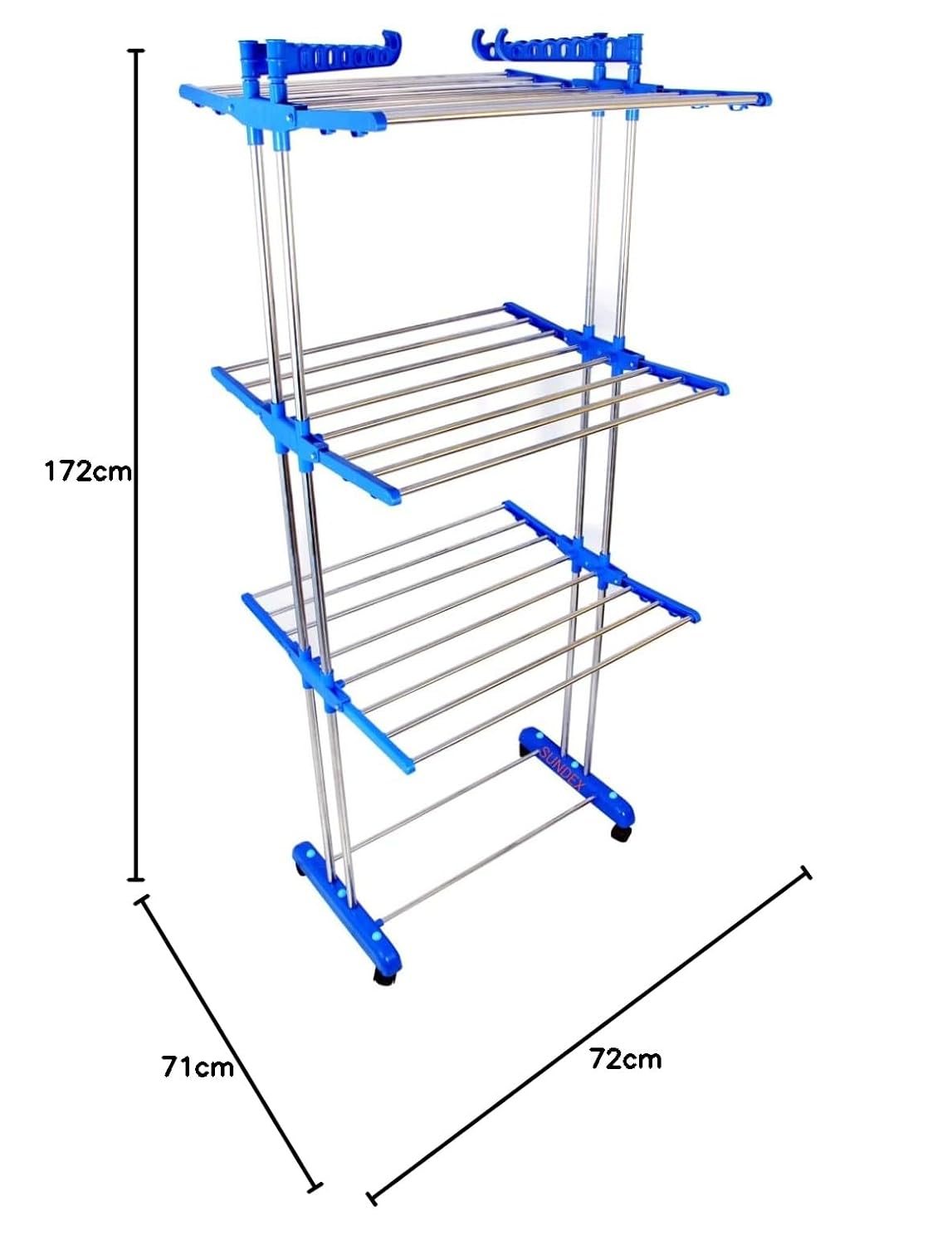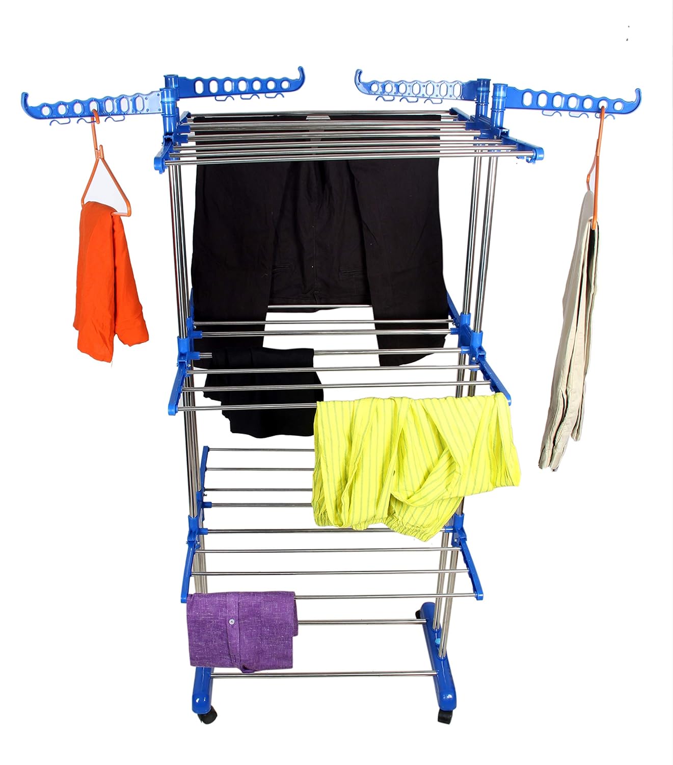 cloth dryer rack having foldable wings to save space, which makes it perfectly suitable for limited space. Besides, it has enough space between the rods for quick air dry and is equipped with upgraded castor wheels which move 360 degree for its easy movement. Do not panic and rush to remove your clothes from your balcony/terrace while it rains, just move it under the fan effortlessly.