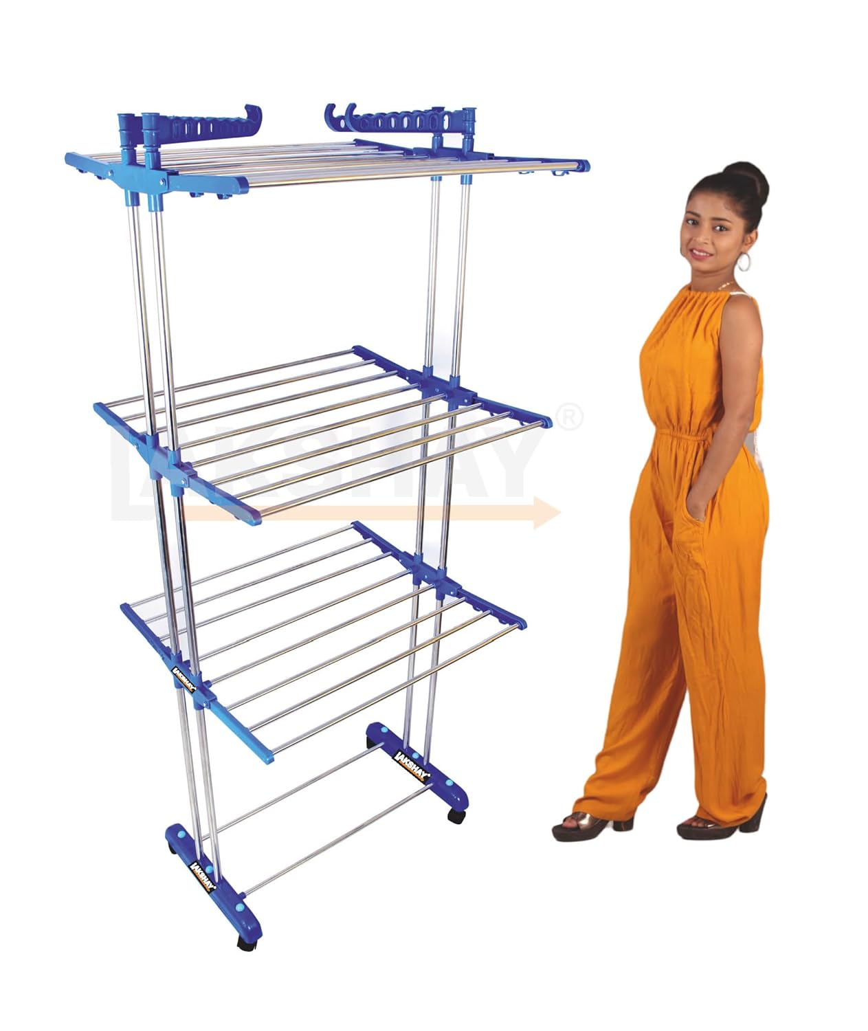 LAKSHAY CLOTH DRYING STAND COLLAPSIBLE DESIGN – The drying rack has 6 Hanging Frames (3 On Each Side Of The Rack). 3 pipes On Each Frame For Drying Lots Of Clothes At Once. Size: (75-126) x 64 x 170 cm and 2 Side Hanger for drying small clothes like handkerchief, babby clothes, etc .6 hanging frames can be folded down and extend out to conserve space .suitable for both indoor and outdoor areas