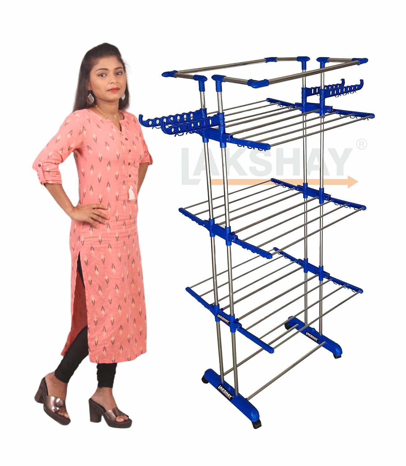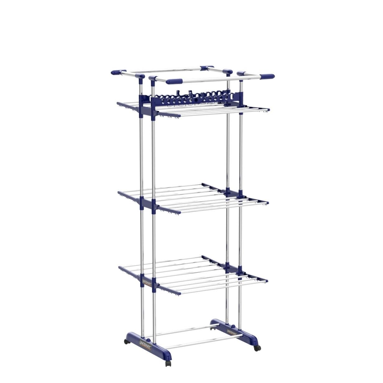 This is a high-quality clothes rack for hanging wet clothes. Wet clothes tend to get heavy when they have soaked up a lot of water. This rack is sturdy and is made from durable steel and can take the weight of heavy wet clothes. Keep it in your balcony for drying your laundry. And if you do not have a space like a balcony for drying clothes, you can use this rack in your rooms. The cloth dryer can be adjusted to stand against wall in half on lesser load or full with maximum load. The multiple folding arms makes in versatile and easy to use. There are additional arms for hanging clothes in a hanger. The hanger can be fixed in the holder of the extended arm. It is an essential product for every house hold with multiple usage.