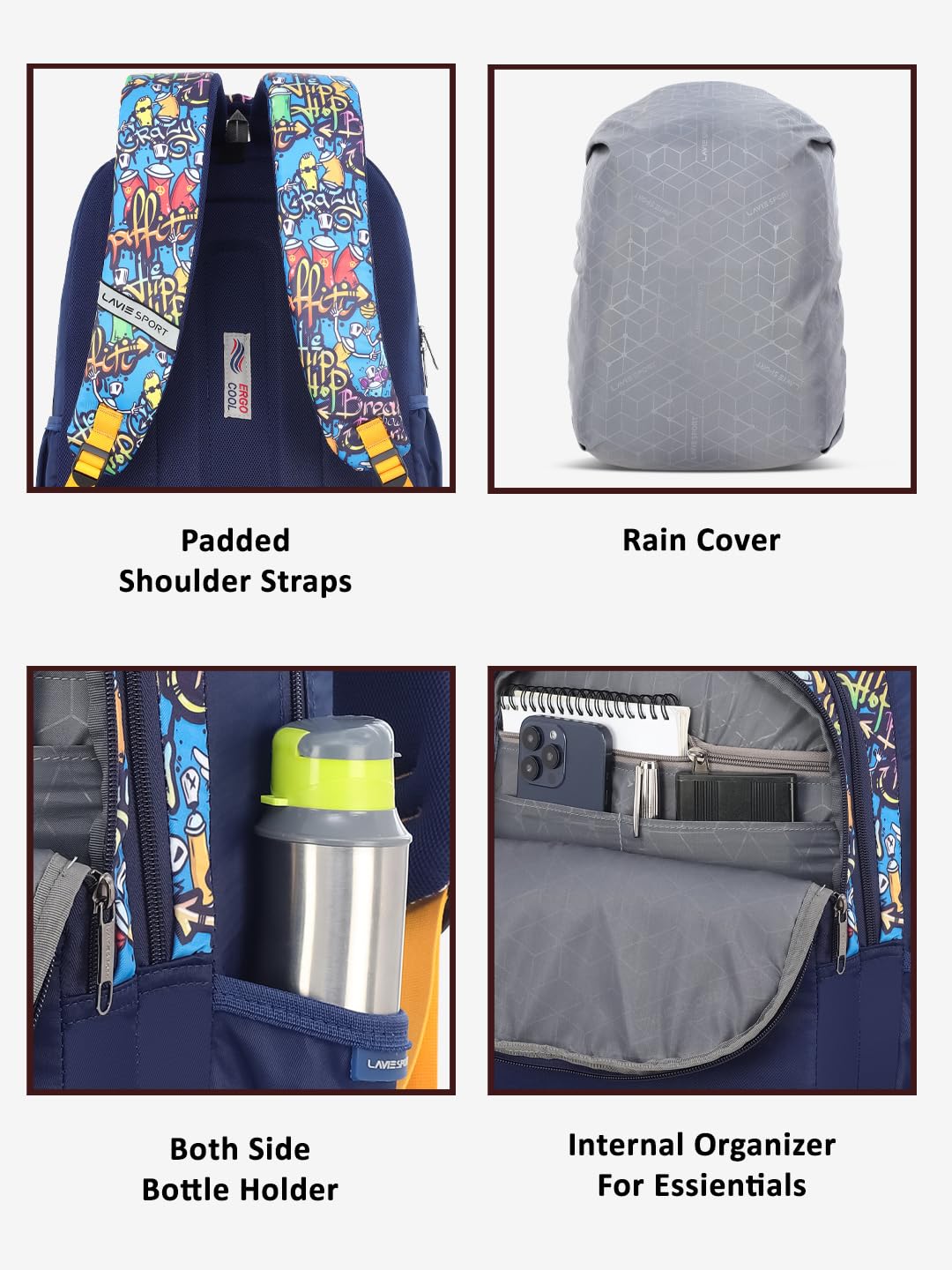 This bag has 3 spacious compartments, 1 front pocket, Dedicated organiser for effortless storage, Padded laptop sleeve, 2 Bottle pocket with adjustable shoulder straps and padded back panel and top handle with a Raincover