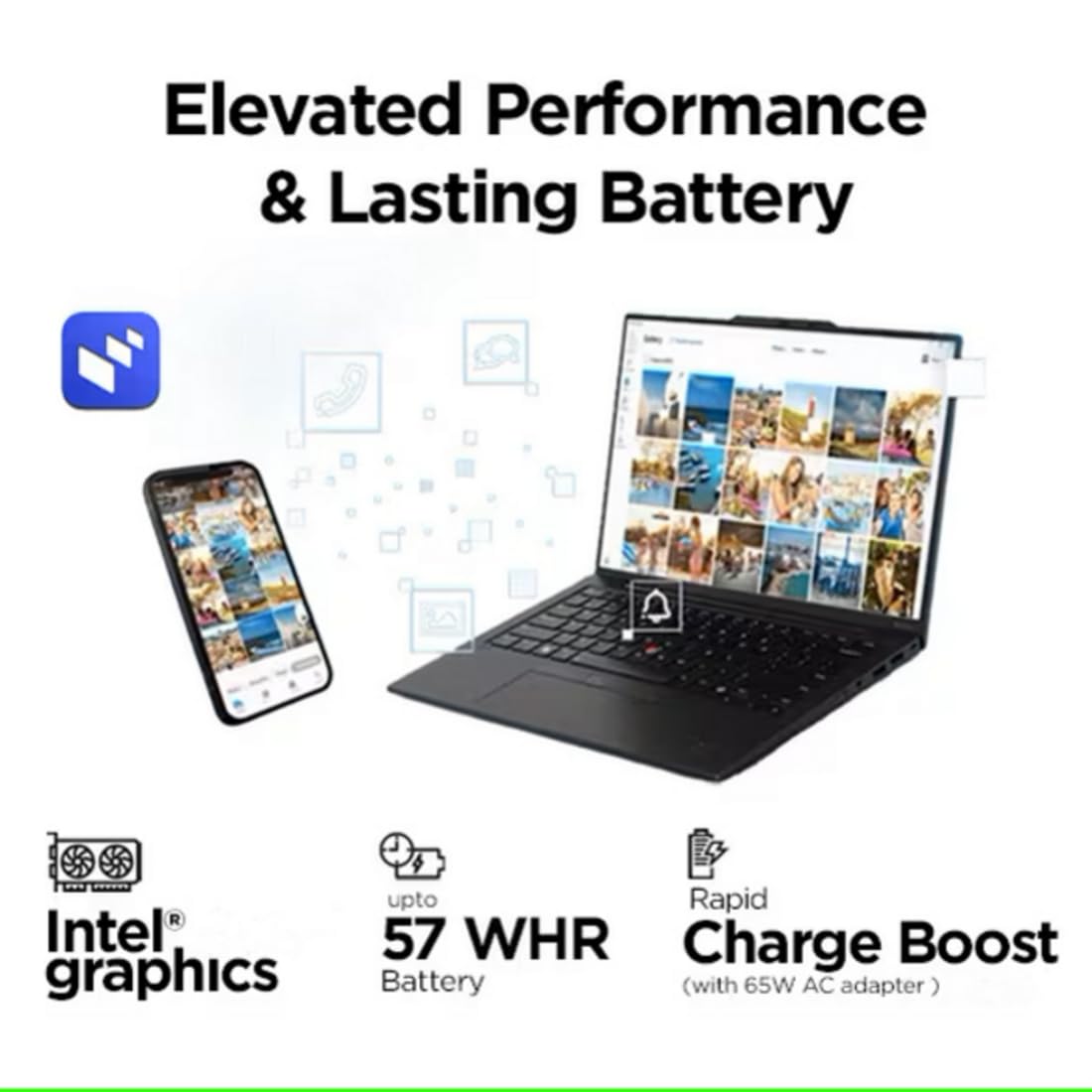 ThinkPad X1 Carbon – featuring powerful Intel® Core™ Ultra processors, designed to enhance graphics performance and elevate AI capabilities. Compared to its predecessors, integrated Intel® Graphics deliver 2x performance boost, ensuring seamless workflows, enriched visual experience, and maximum encoding speed without any slowdown.