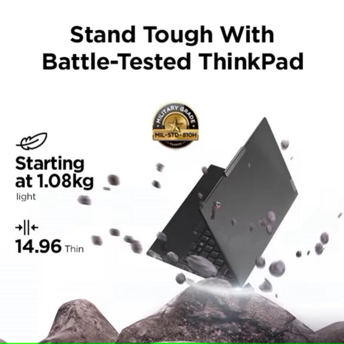 ThinkPad Reliability tested on 12 MIL-STD-810H Methods and 22 Procedures | Body Material: Carbon Fiber (Top), Aluminium (Bottom) | Built to withstand rugged usage and can handle accidental knocks, drops, and even spills