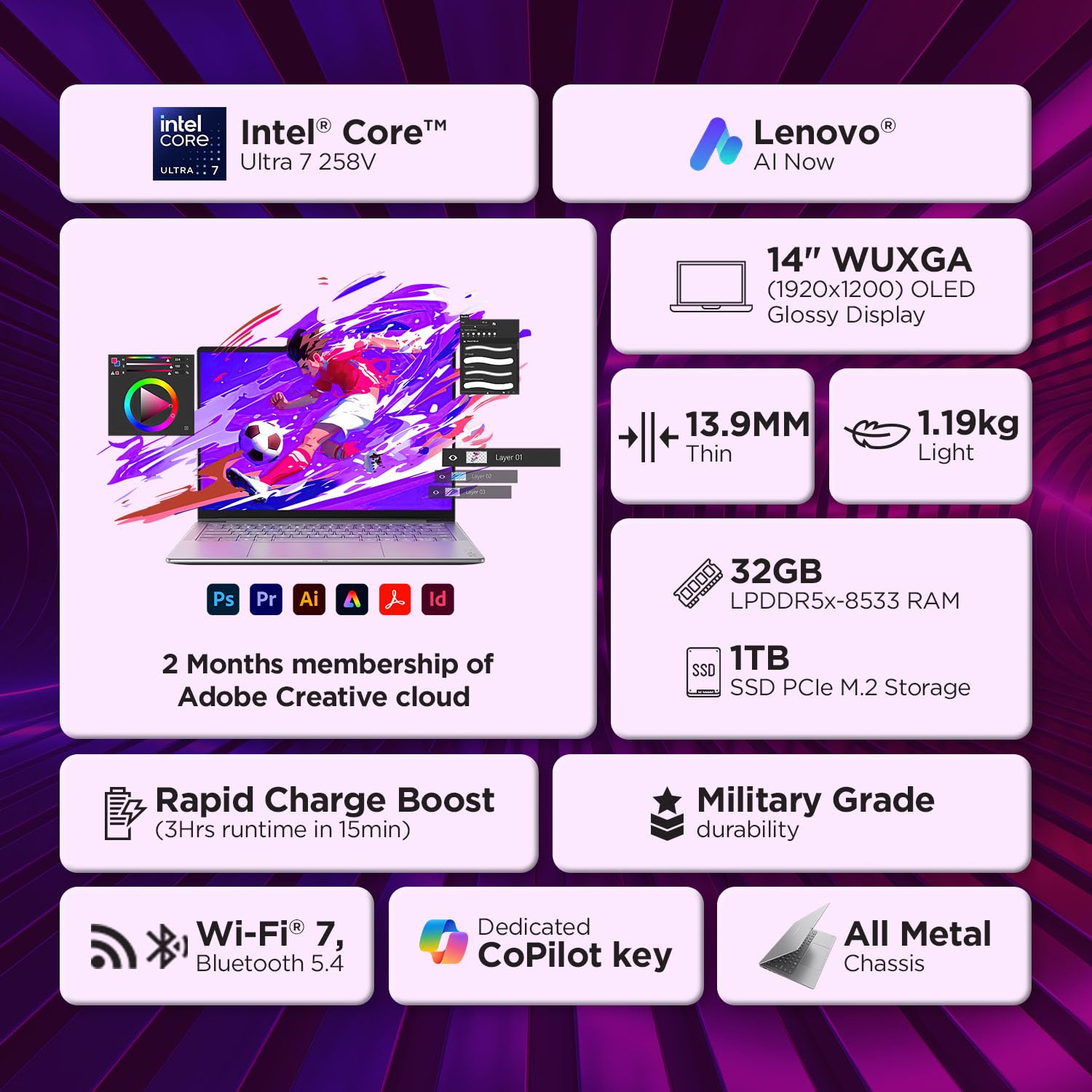 Processor: Intel Evo Core Ultra 7 258V | 8C (4P + 4LPE) / 8T, Max Turbo upto 4.8GHz | 8 Cores | 8 Threads | Cache: 12MB || NPU: Integrated Intel AI Boost, up to 47 TOPS