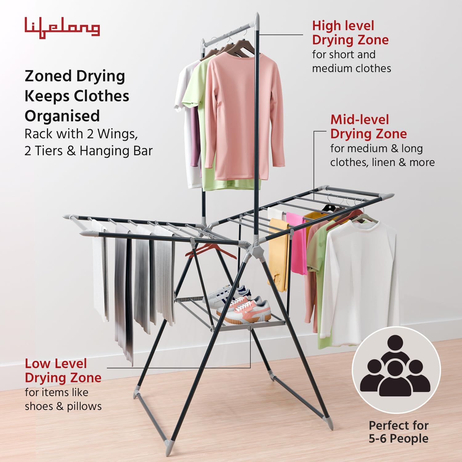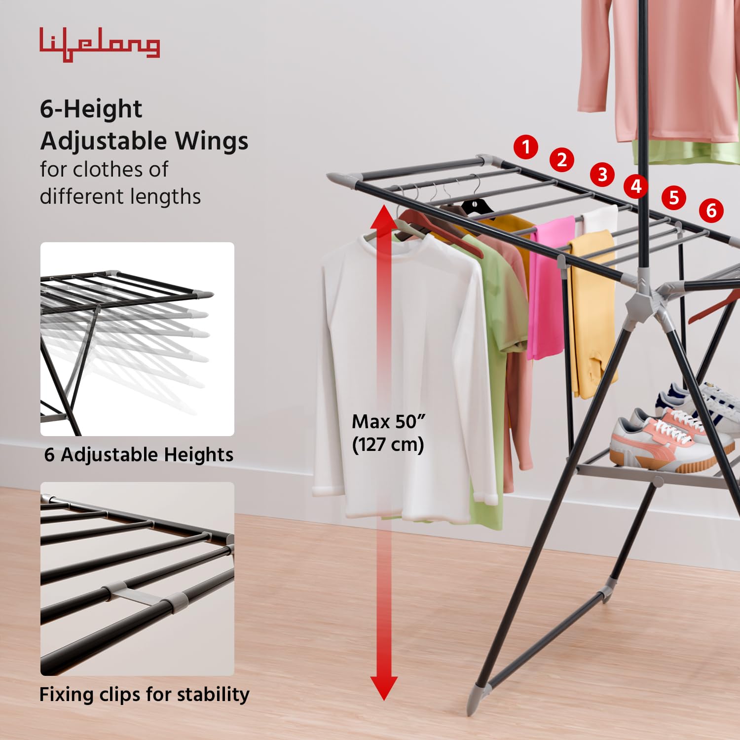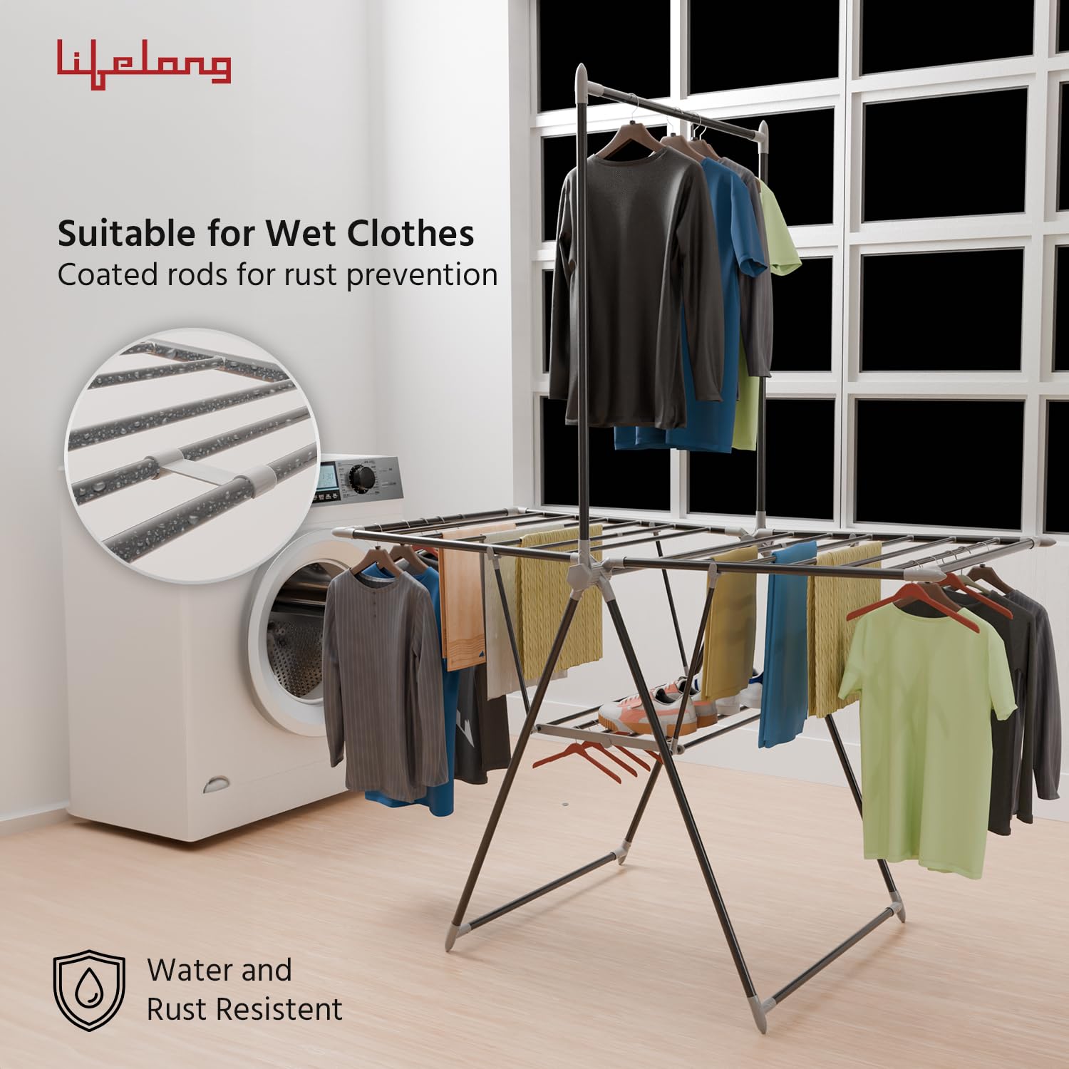 Efficiently dry your clothes with our versatile Lifelong Clothes Stand, designed for space-saving and optimal airflow. Perfect for indoor and outdoor use, it accommodates various garment sizes and types.