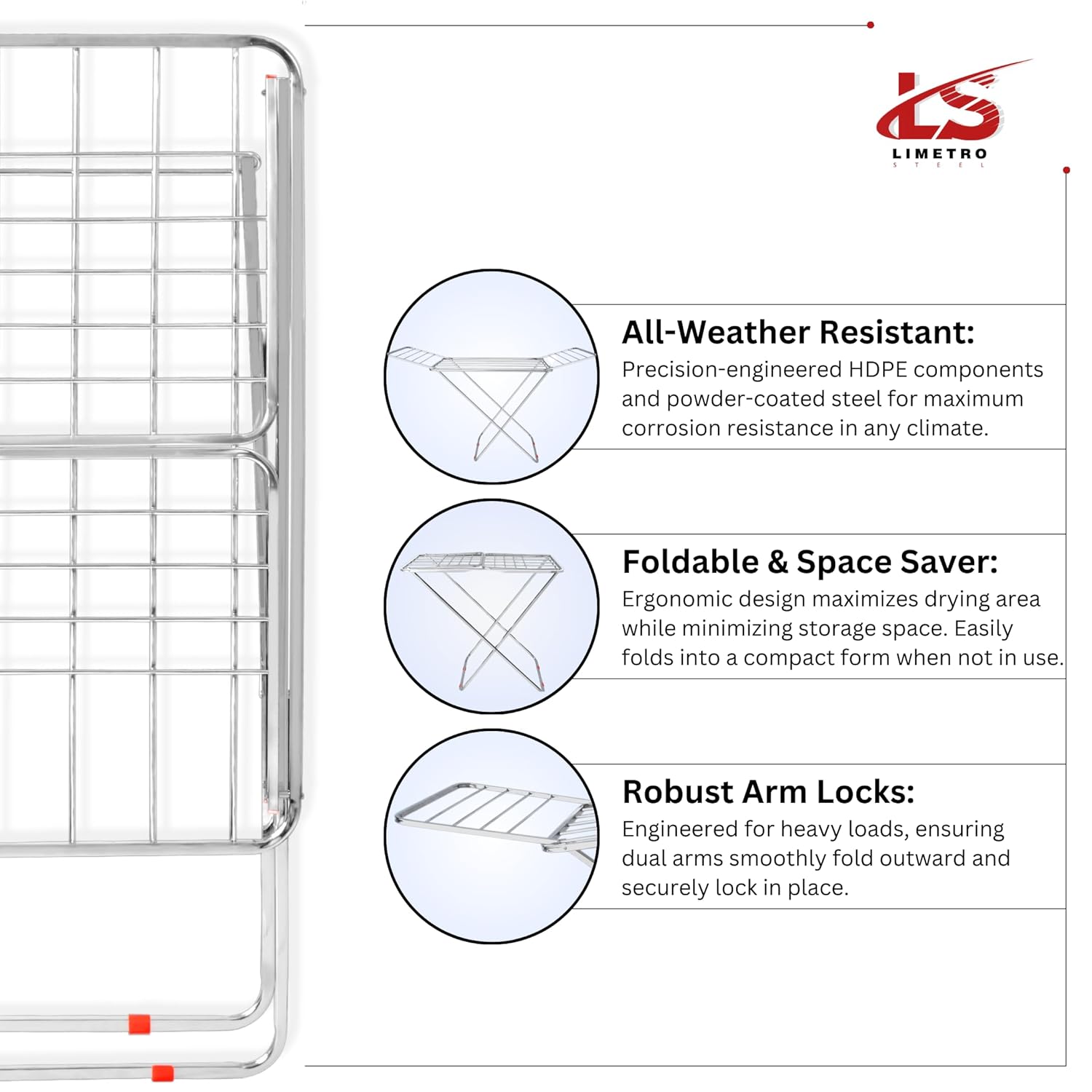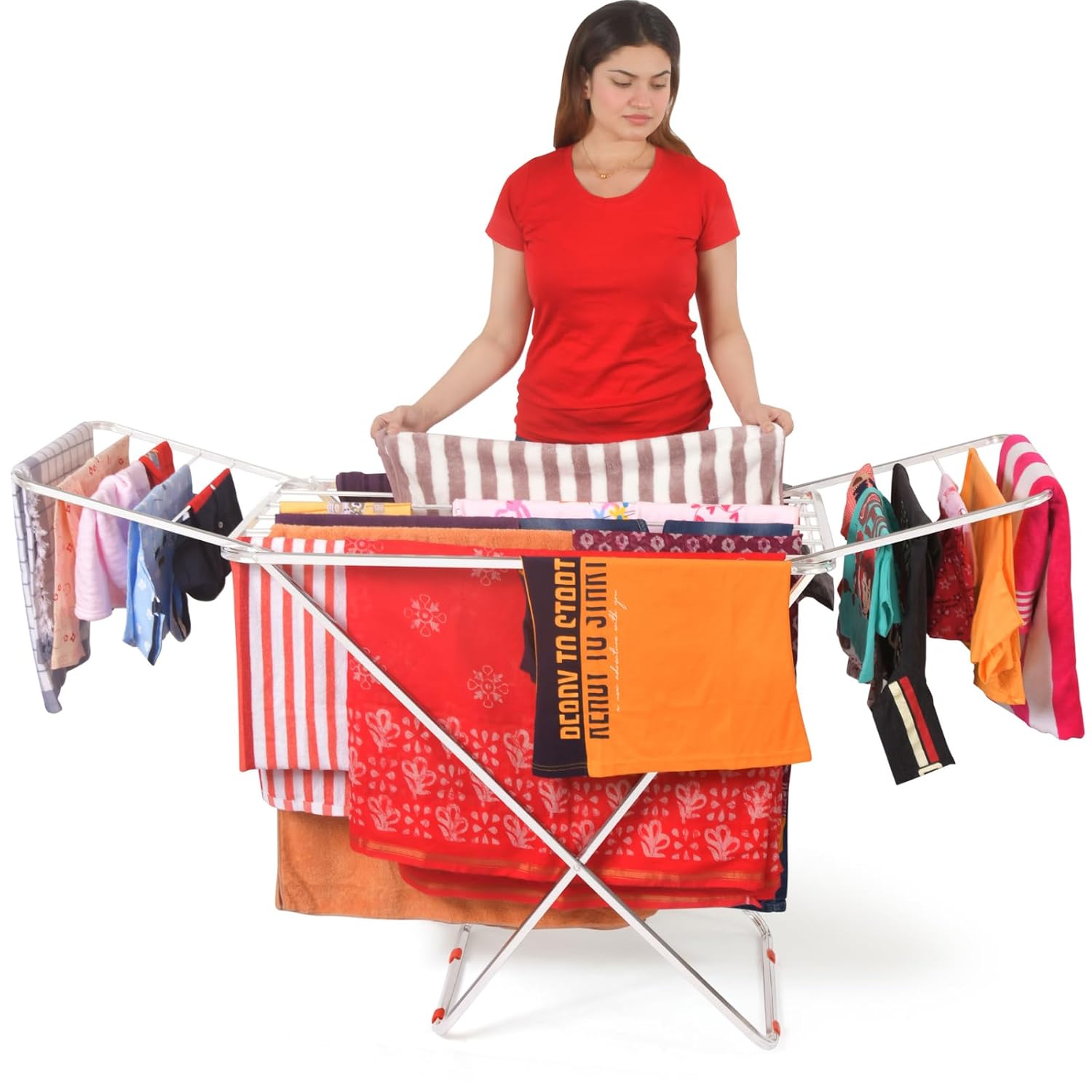 ✅ DESIGN AND UNIQUE FEATURES : 100 % Stainless Steel including Screws and Fasteners making it rust and corrosion free !!: Strong construction with large drying space with high quality metal construction, more sturdy and durable you can position your clothes with a nice amount of space between them so they can dry thoroughly.100 % Stainless Steel including Screws and Fasteners making it rust and corrosion free !!