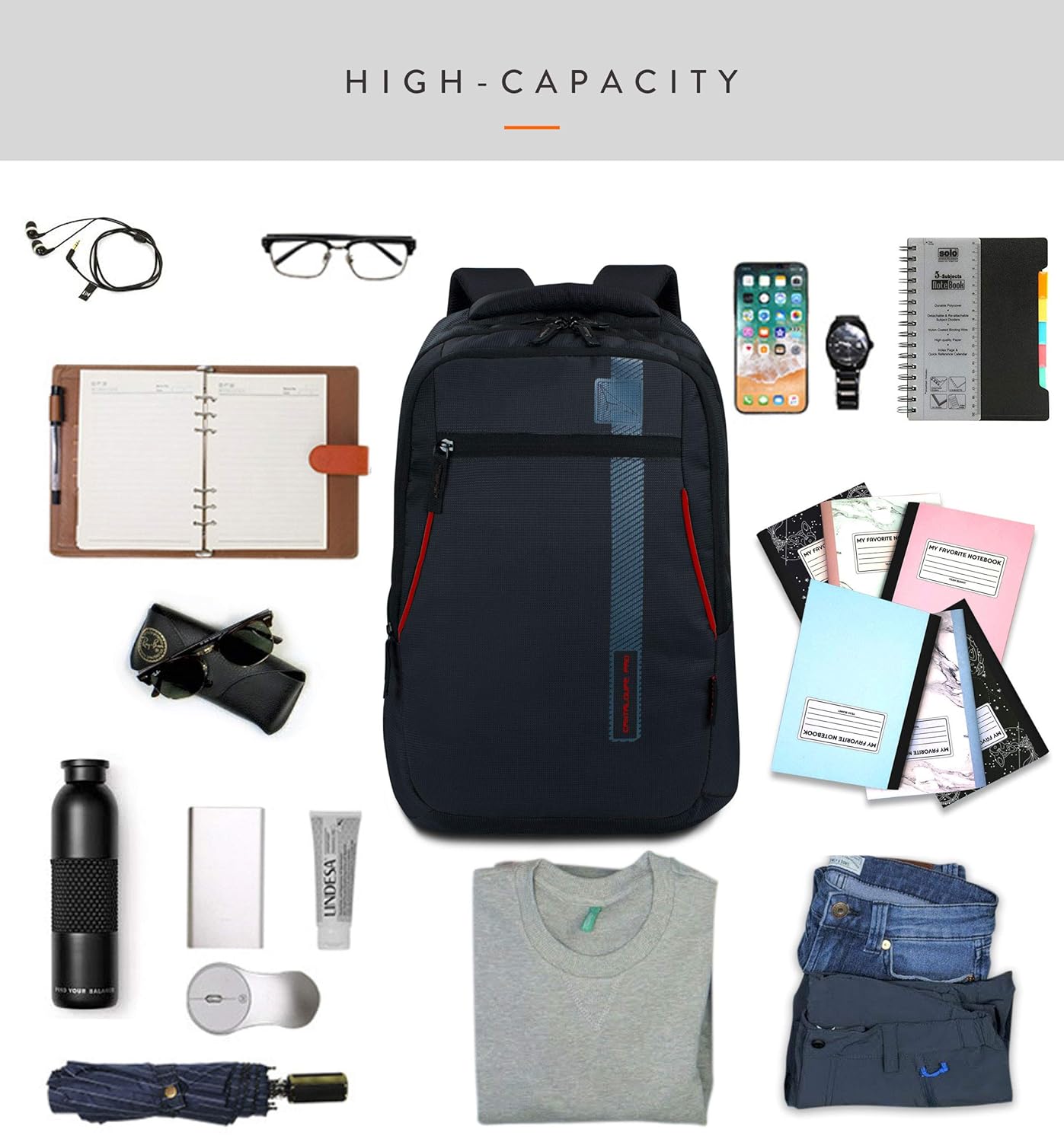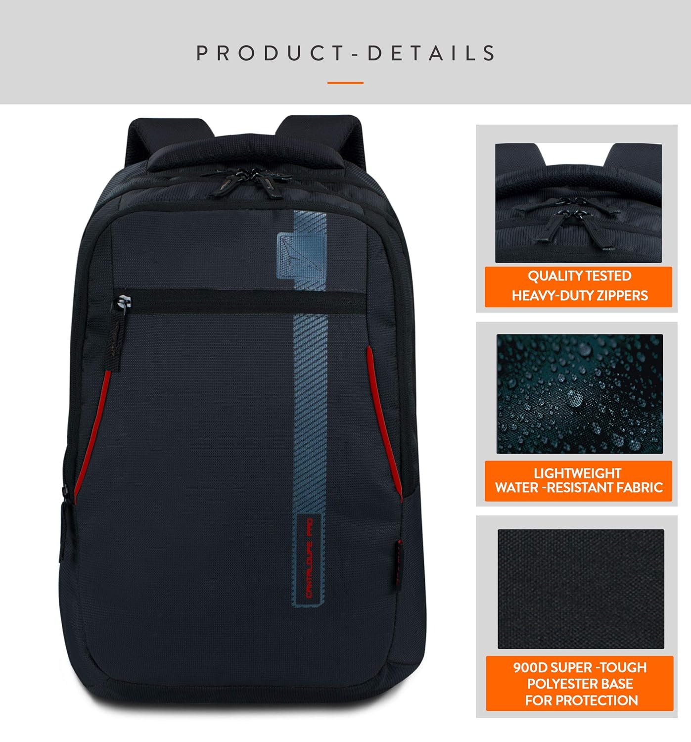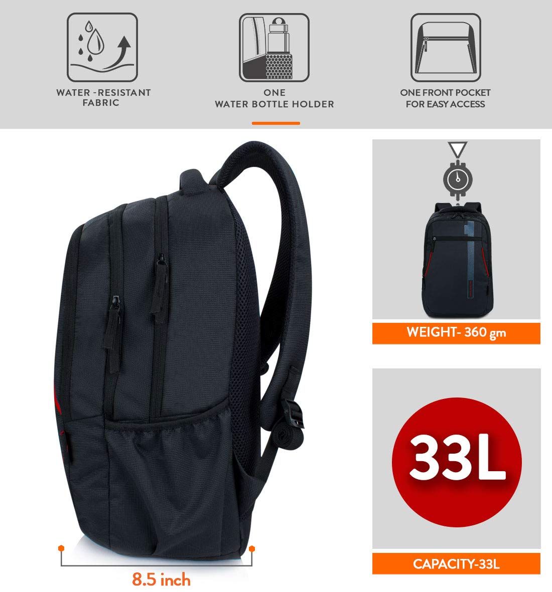 Lunar’s Cantaloupe Pro : A Spacious and durable backpack for casual usage, school / college / office and travel. Size: 18 inch X 13 inch X 8.5 inch. Capacity: 33 liters. Bagpack is made of high grade water resistant polyester material that gives it strength and durable for long-term use. This “MAKE IN INDIA” Product features 3 large zippered compartments, 1 vertical highlighted long zip pocket at front, 1 water bottle /umbrella pockets, Top padded Handle for comfort, 3D air ventilated back panel for preventing sweat, heavy duty zippers and sliders, and adjustable straps.