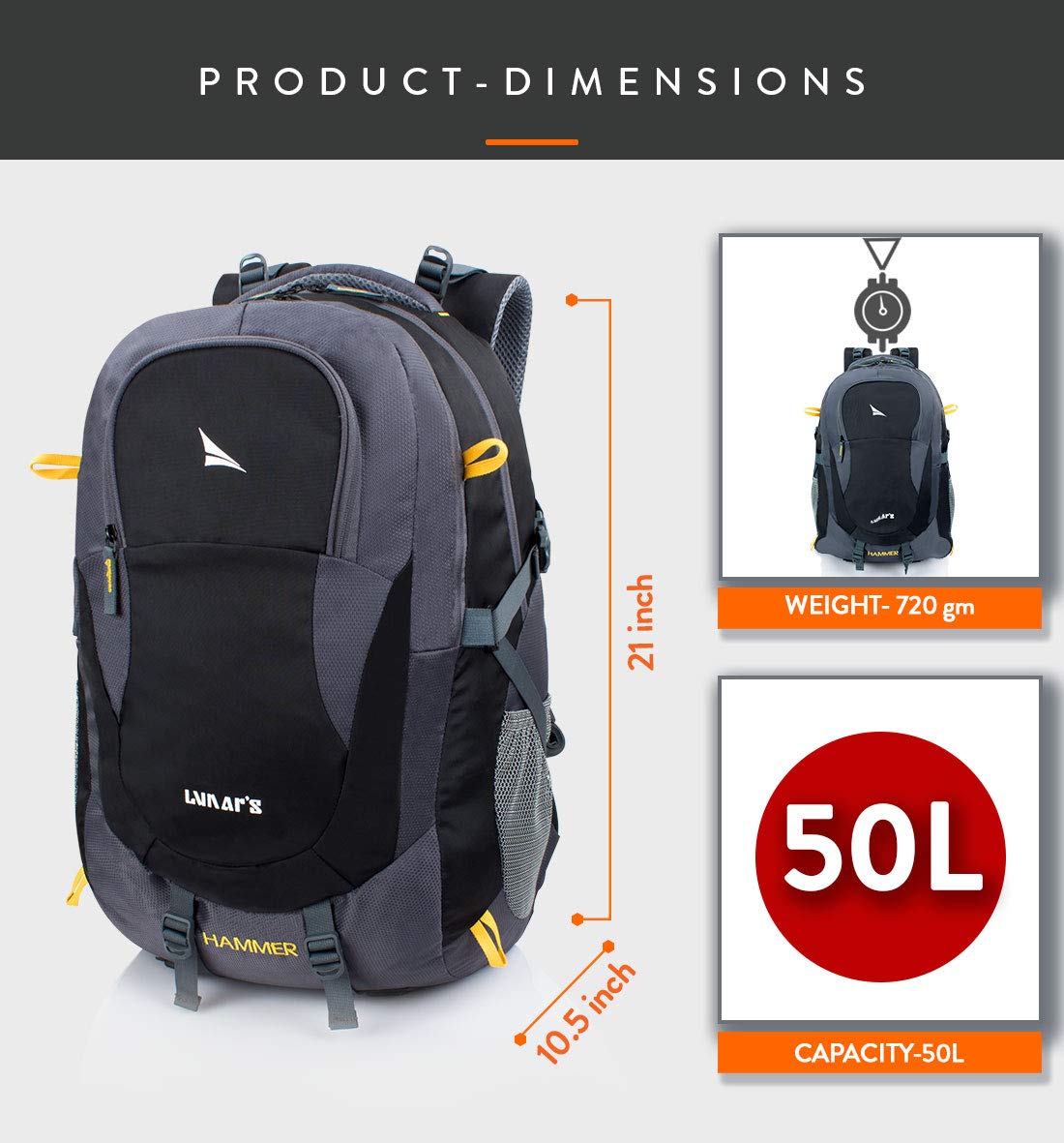 Lunar’s Laptop Travel Bag : A Spacious and durable laptop backpack for travel, casual usage, school / college / office and travel. Size: 21 inch X 14 inch X 10.5 inch. Capacity: 50 liters. This travel bagpack is made of high grade water resistant polyester material that gives it strength and durable for long-term use. This “MAKE IN INDIA” Product features 2 large zippered compartments, padded laptop sleeve for upto 17.3″ laptops, internal organiser, 2 water bottle /umbrella pockets, padded handle, inbuilt raincover, chest pocket, adjustable strap, hip belt quick haul grab loop for comfort, 3D air ventilated back panel for preventing sweat, heavy duty zippers and sliders, and adjustable straps. Ideal bag for boys, girls, men and women