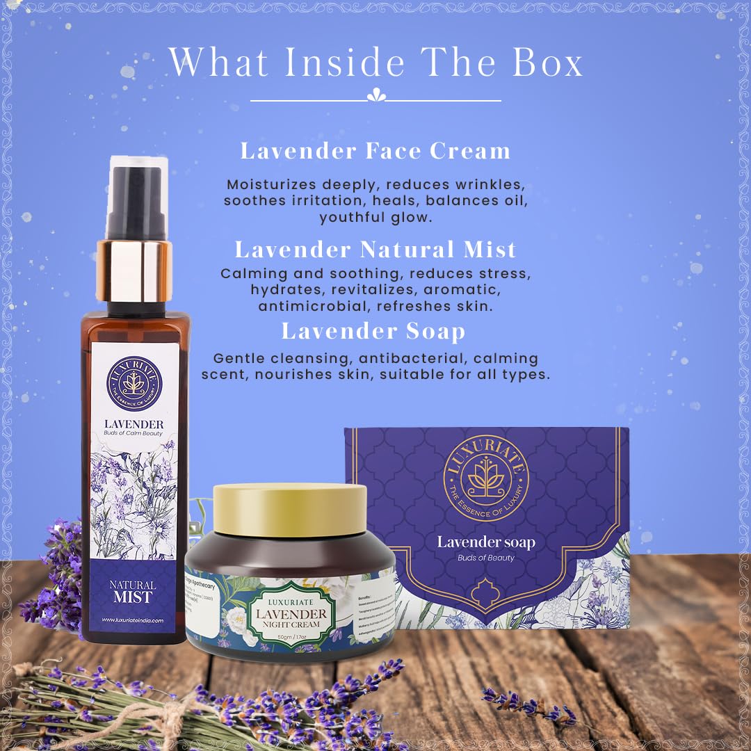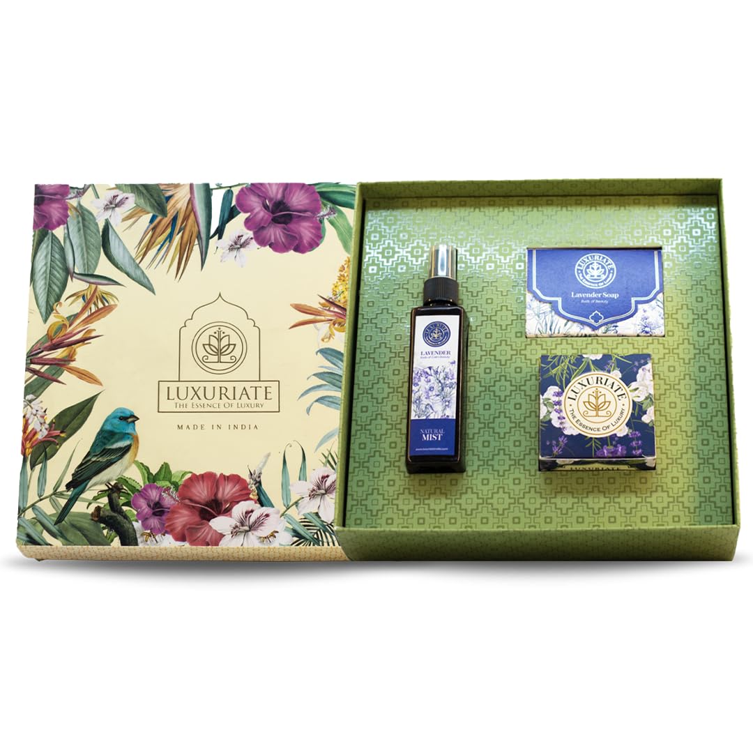 Indulge in the ultimate skincare experience with the LUXURIATE Lavender Skin Care Gift Set Box. This exquisite 3-piece set includes a luxurious lavender soap, a rejuvenating lavender face cream, and a refreshing lavender face mist, all designed to provide a complete facial care routine. Each product is infused with the soothing and aromatic essence of lavender, known for its calming and therapeutic properties. The luxurious lavender soap gently cleanses your skin, removing impurities without stripping away natural oils. Its rich, creamy lather leaves your skin feeling soft, smooth, and refreshed. The rejuvenating lavender face cream deeply hydrates and nourishes your skin, promoting a youthful and radiant complexion. Enriched with natural ingredients, it helps to reduce the appearance of fine lines and wrinkles, leaving your skin looking firm and revitalized. The refreshing lavender face mist provides an instant burst of hydration, revitalizing your skin and leaving it feeling cool and invigorated. This versatile mist can be used throughout the day to refresh your skin or set your makeup for a dewy, glowing finish. The LUXURIATE Lavender Skin Care Gift Set Box is perfect for all skin types, making it an ideal gift for yourself or a loved one. Experience the luxury and benefits of lavender with this beautifully packaged gift set. Pamper your skin and elevate your skincare routine with LUXURIATE’s premium products, designed to provide a spa-like experience in the comfort of your own home. This gift set is perfect for festive occasions, weddings, and other special celebrations, making it a thoughtful and luxurious present for any event.