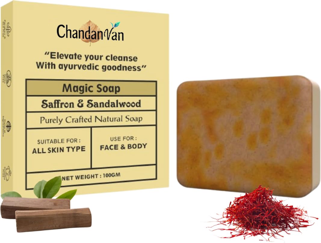 Experience the luxurious blend of traditional Ayurvedic ingredients with this handcrafted Magic Soap featuring premium Saffron and Sandalwood. This 100-gram soap bar is meticulously crafted to provide a natural cleansing experience for both face and body. The rich combination of precious saffron, known for its skin-brightening properties, and aromatic sandalwood creates a harmonious bathing ritual. Suitable for all skin types, this paraben-free soap offers a gentle yet effective cleansing experience. The natural ingredients work together to help achieve a radiant complexion while maintaining skin’s natural moisture balance. Perfect for daily use, this versatile soap bar brings the goodness of time-tested Ayurvedic ingredients to your modern skincare routine. The authentic aroma of sandalwood combined with the exotic essence of saffron transforms your regular bathing experience into a spa-like ritual.