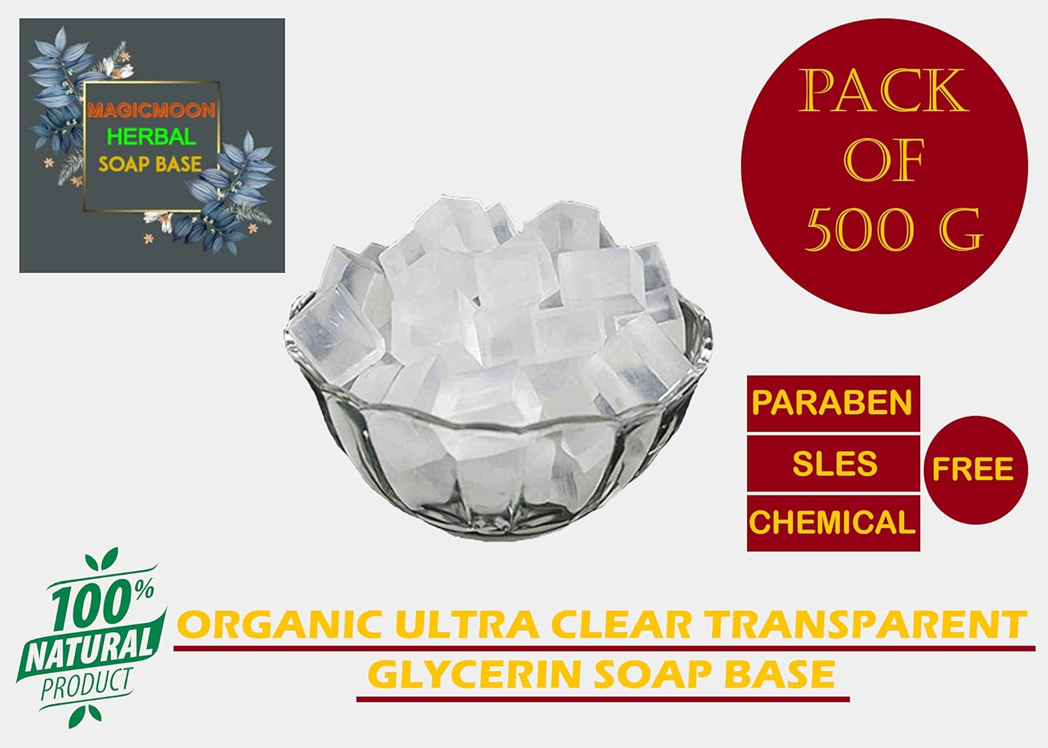 Magicmoon 400 Gram Ultra Clear Glycerin Transparent Soap Base (Sles , Sls , Paraben Free). Magicmoon Ultra Clear Glycerin Transparent melt and pour soap base is best suited for both household and commercial production and is perfect for making plain transparent bars with luxurious lather and sparkling clarity . It is produced from the highest quality vegetable oil extracts . Transparent soap base , also known as glycerin Soap base . It is free from preservatives , sls , sles , and paraben free . Glycerin , a natural emolients , draws moisture from the air to benefits skin health. Raw material for hand made soap . It is widely used to produce the clear hand soap, craft soap, natural essential oil soap in cosmetics. it is the best raw material for home made soap or large scale soap.