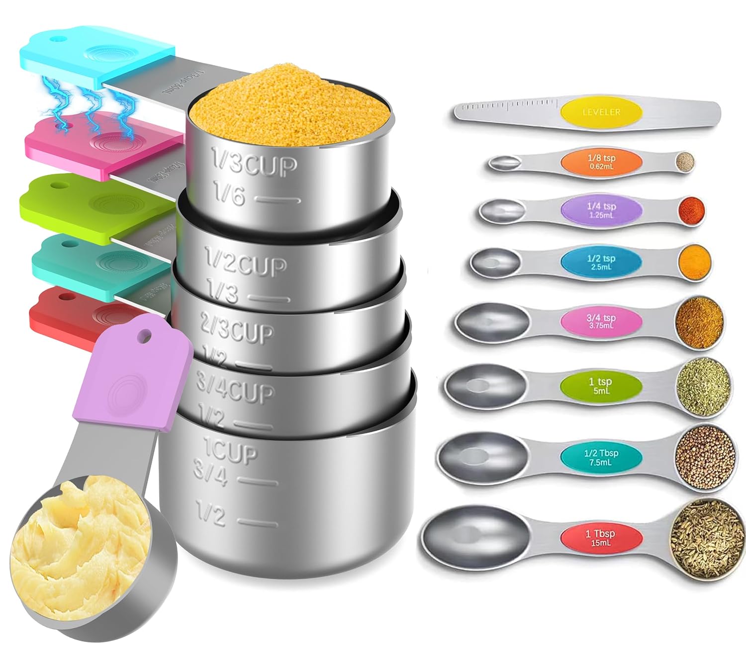 8 Magnetic Stainless Steel Measuring Cups: 1/16cup-15ml, 1/8cup-30ml, 1/4cup-60ml, 1/3cup-80ml, 1/2cup-120ml, 2/3cup-160ml, 3/4cup-180ml, 1cup-240ml. 8 Magnetic Measuring Spoons and 1 LEVELER: 1/16tsp-0.33ml, 1/8tsp-0.62ml, 1/4tsp-1.25ml, 1/2tsp-2.5ml, 3/4tsp-3.75ml, 1tsp-5ml , 1/2tbsp-7.5ml, 1tbsp-15ml.