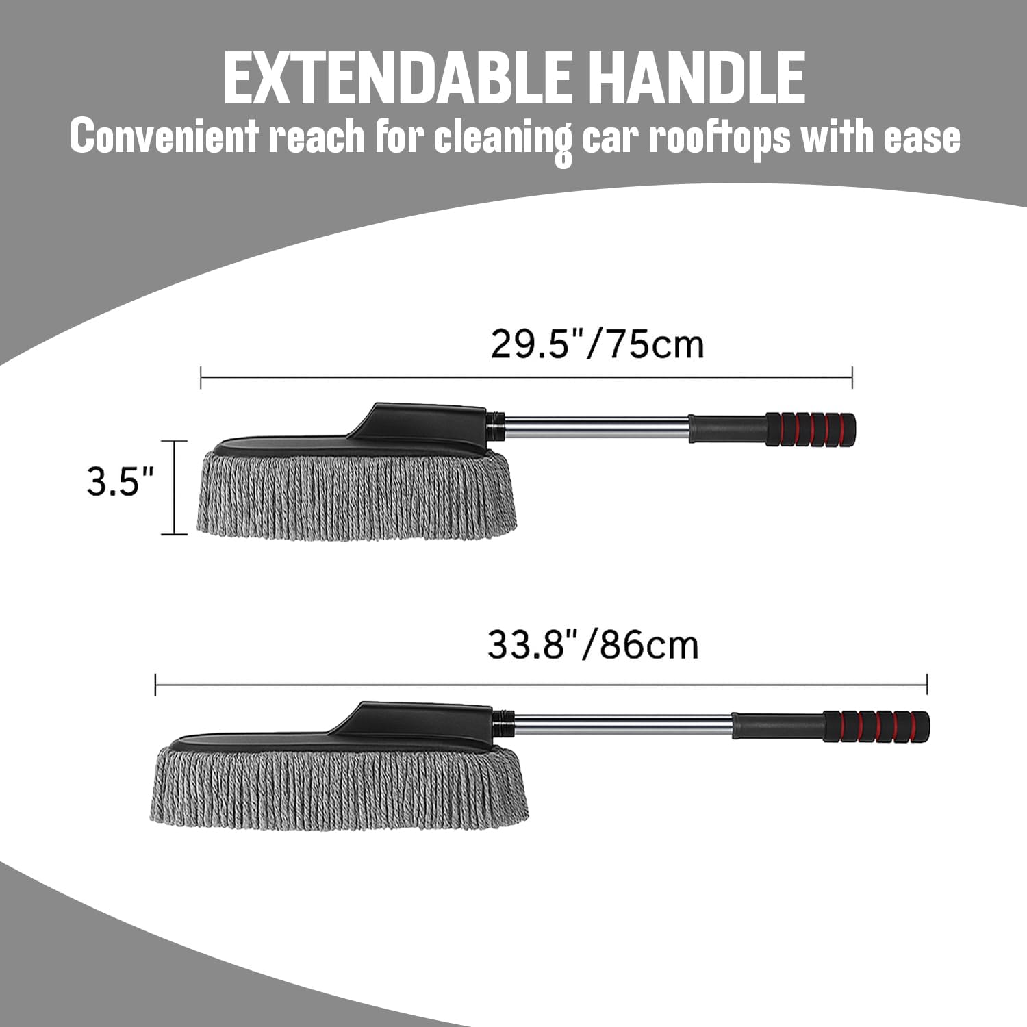 Extendable Handle for Effortless Cleaning: Comfortable rotating handle of this car cleaner makes it an ergonomic design, feels soft and comfortable, both non-slip and lightweight, increases grip strength and can be operated easily. The Extendable Handle of this car brush for cleaning makes it easy for short people to reach the roof, windshield, bonnet and other hard-to-reach areas of a car as well as other large vehicle, and avoids hand fatigue or back pain caused by bending to clean the lower areas of the vehicles.