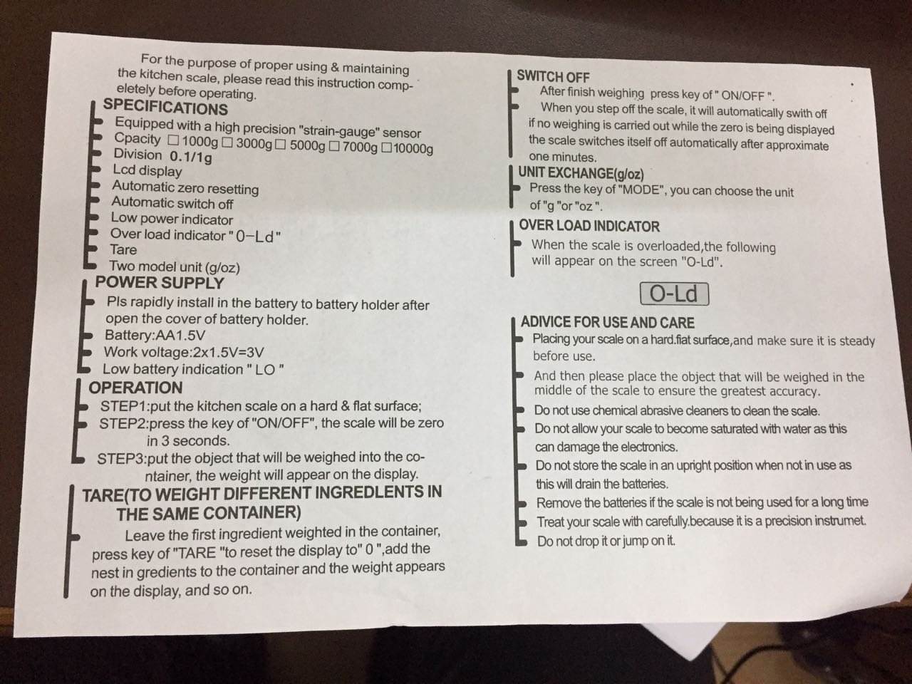 Healthy diet is an essential part of everyday life; do you want to join the ranks of healthy eating? Or are you worry about how to choose a digital kitchen scale? Please pay attention to this digital kitchen scales, it will be your best choice. This is a professional scale designed for kitchen, mail room or even your workshop. It has a large tray. MCP Introducing the multifunctional Digital Kitchen Scale with LCD backlight, in high-quality ABS plastic. designed to simplify the most commonly food items (butter, sugar, flour, eggs, chocolate, etc.), and other items. Simply place the food item/product on Easelife weighing platform, and with the push of a button instant value are displayed the scale’s large high contrast LCD display. Features: Wide LCD screen display ABS engineering plastic as main material Low power consumption The digital scale can be stored virtually anywhere Tare Function The scale will automatically have switched off when it is in non-use condition in order to save power. Our products are backed by 6 Month warranty and lifetime support. Specifications: Capacity: 1g-10000g Units: g, oz Display: LCD with Backlit Power supply: 1.5v x 2 AA battery (included) or AC/DC adaptor 9v/100mA (not included) Colour: White Note: Do not disassemble your scale Store your scale in a clean and dry environment. Dust, dirt and moisture on the weighing sensors and electronics may cause inaccuracy or malfunction. Keep weighing items on a flat and level surface, free from vibrations and drafts. Do not drop items onto the weighing platform violently, gently treat all items. Check the batteries first if there is any trouble with your scale. This simple step can remedy most scale issues. WARNING: When you weighing, please lay the scale on hard and flat surface. Don’t weight items more than 10kg or less than 1g.