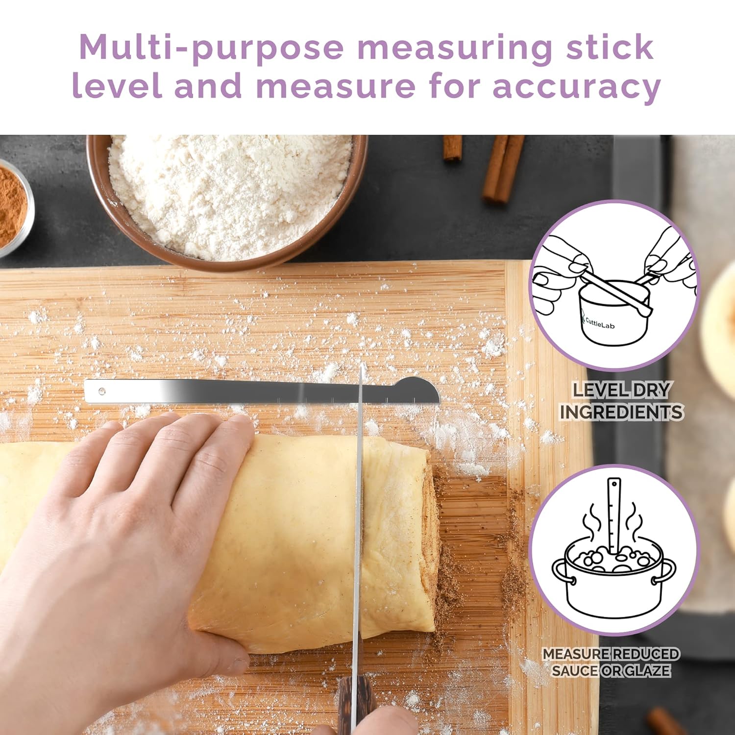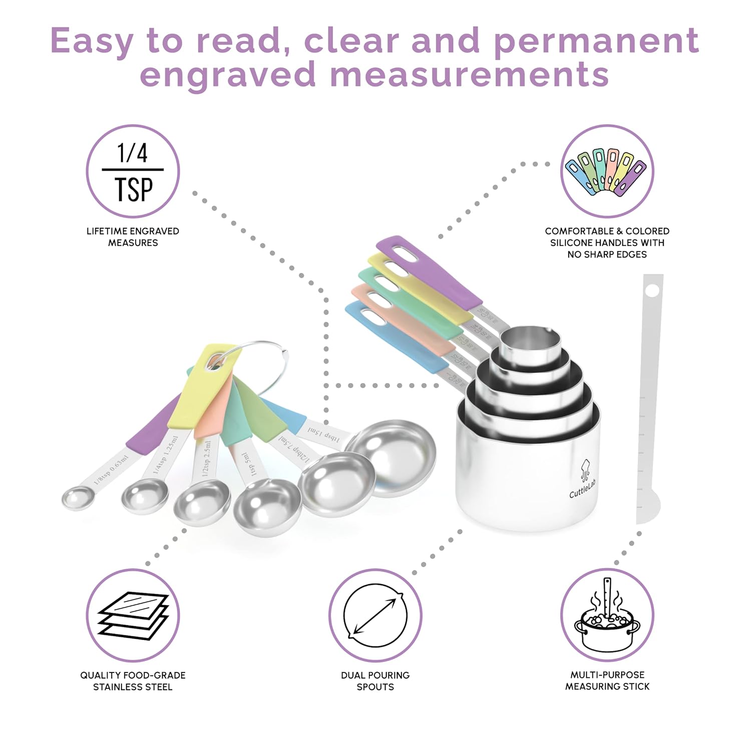 All measurements on the CuttleLab 14-Piece Set are engraved, allowing you to measure your wet or dry ingredients with accuracy, so essential for superb cooking! These engraved measurements are permanent—they won’t wear off even after heavy use! The CuttleLab Set also presents (1) the leveling tool, useful for those cup and spoon quantities that must be level. Notice that one side of this tool is calibrated in centimeters for use as a mini-ruler. You can now measure things like lengths of dough or the depth of a reduced sauce. (2) Two stainless-steel hinged rings are included to help make storing easy. You can hang up the cups and spoons for immediate and easy reach, or keep them together in your favorite drawer. (3) Pretty colored handles, made of dishwasher safe silicone, come in multiple sets of colors: the smooth“Cotton Candy”, the relaxing “Farmhouse”, the elegant “Charcoal” and chic “Country Chic”. May you thoroughly enjoy using CuttleLab’s versatile set of 14 pieces!