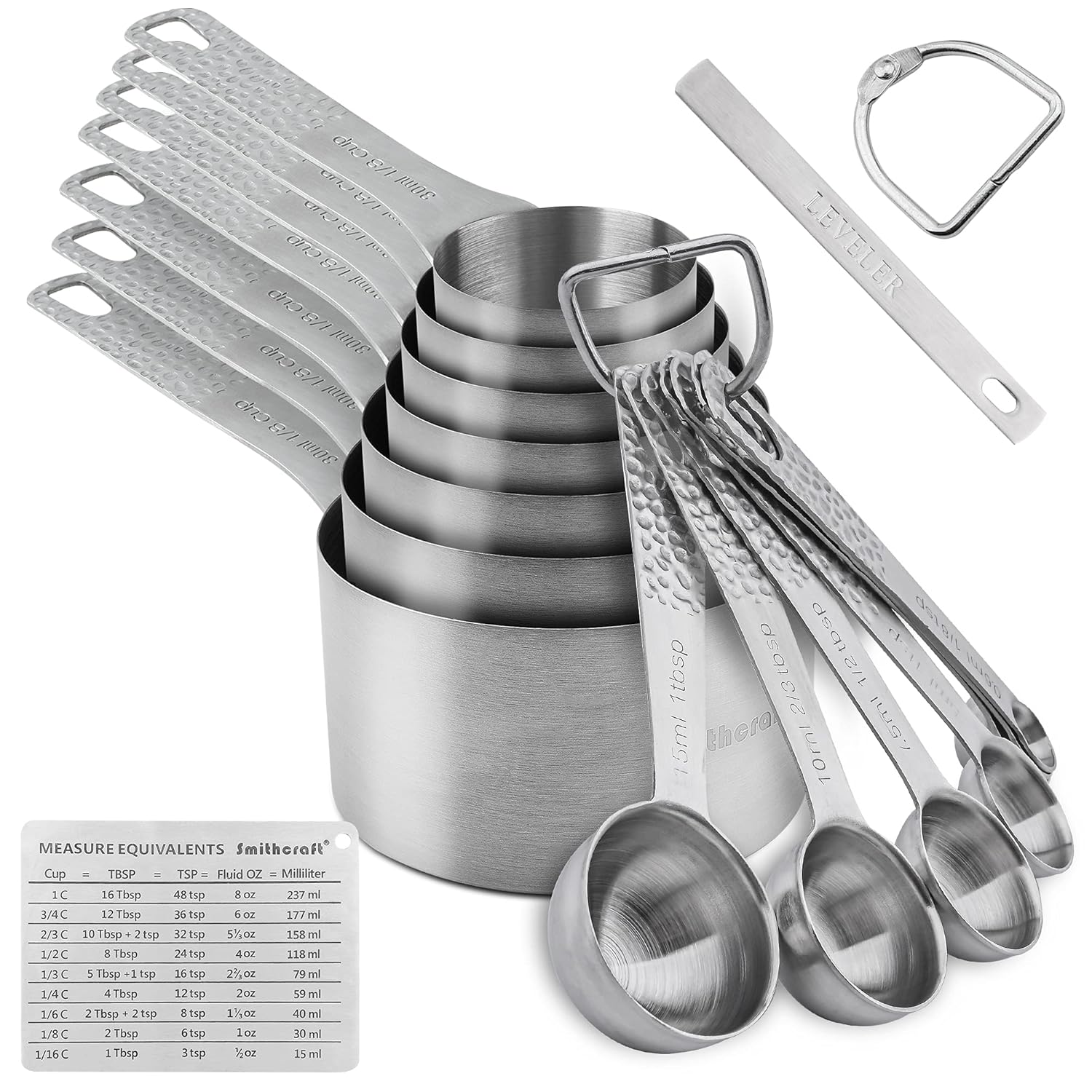 7 measuring cups and 7 measuring spoons with1 Leveler and 1 Measure equivalents.