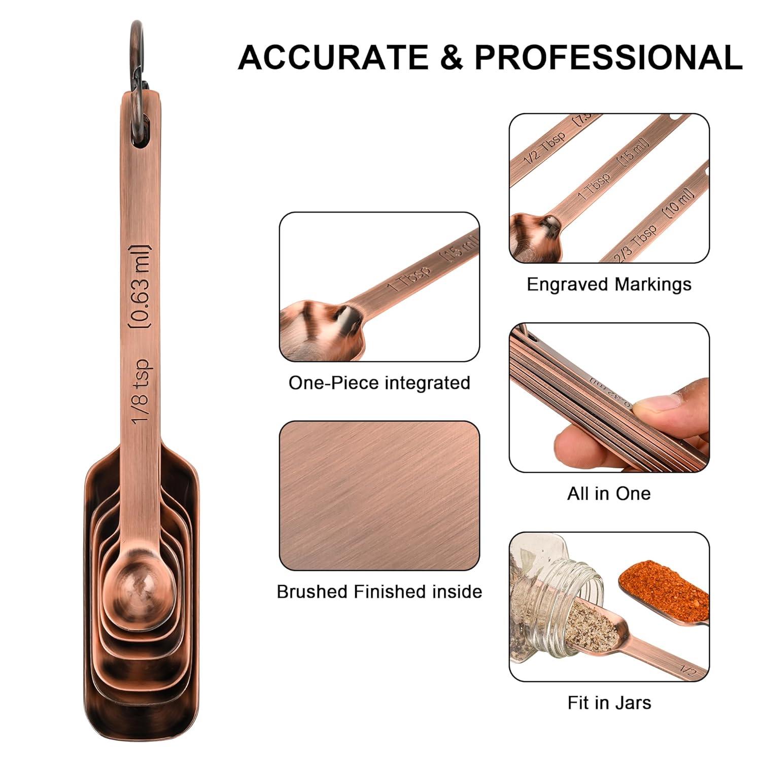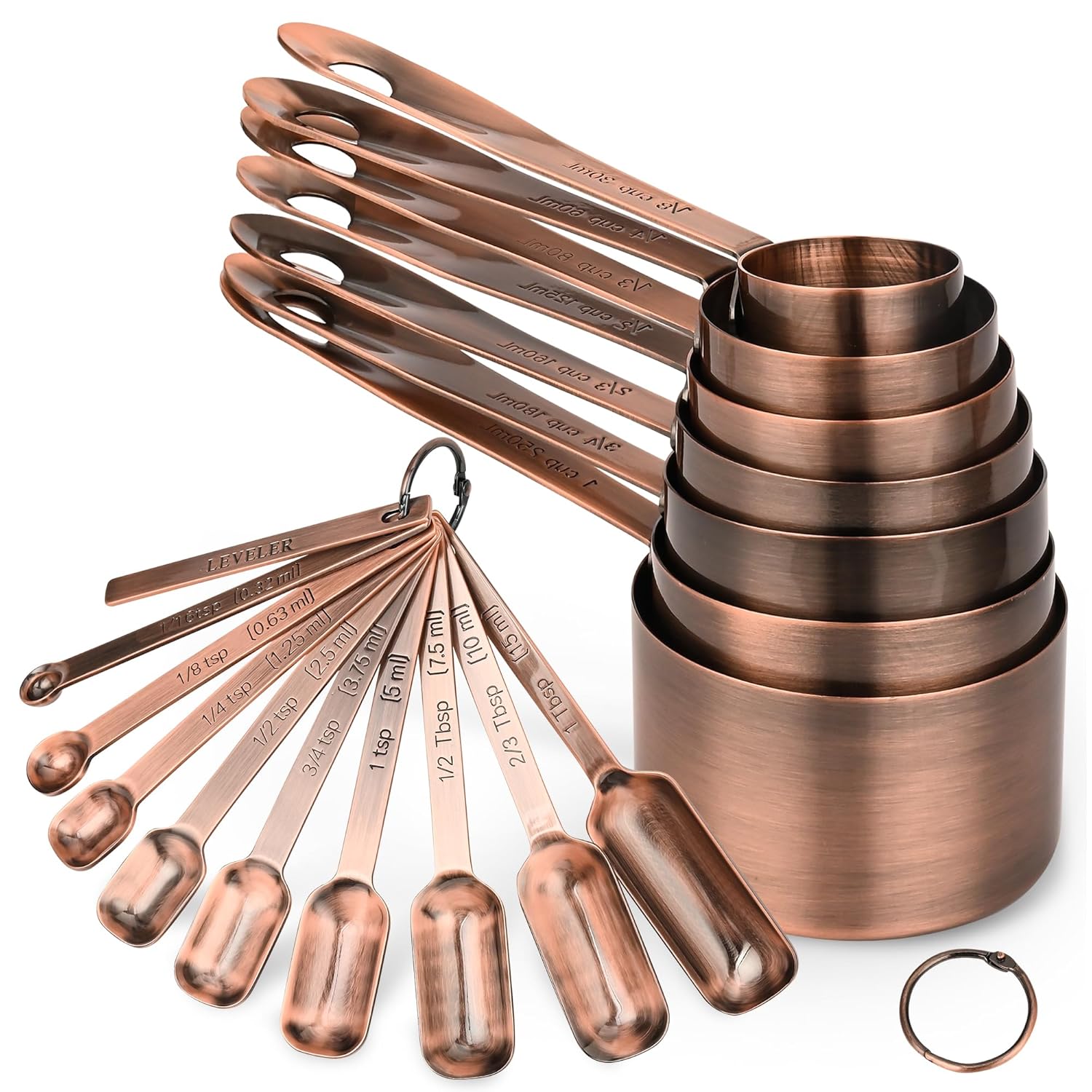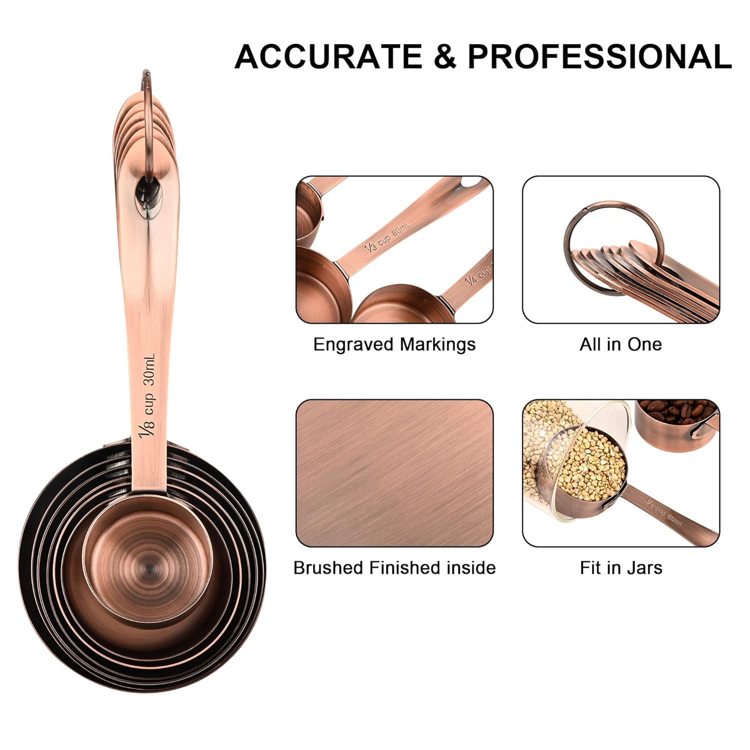 Kalsreui Copper Measuring Cups and Spoons Set 17, 7 Copper Measuring Cups Set and 9 Copper Measuring Spoons & 1 Leveler, all Measuring Cups and Measuring Spoons sizes are included in one set! Meet all your needs on cooking and baking :