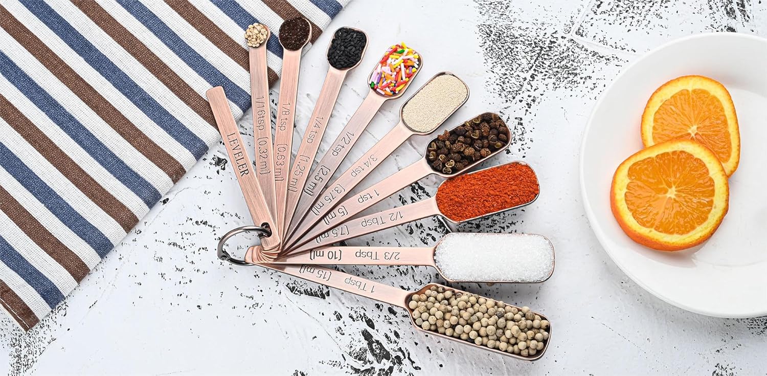 2. Measuring cups and spoons Materials: Stainless Steel with copper finish
