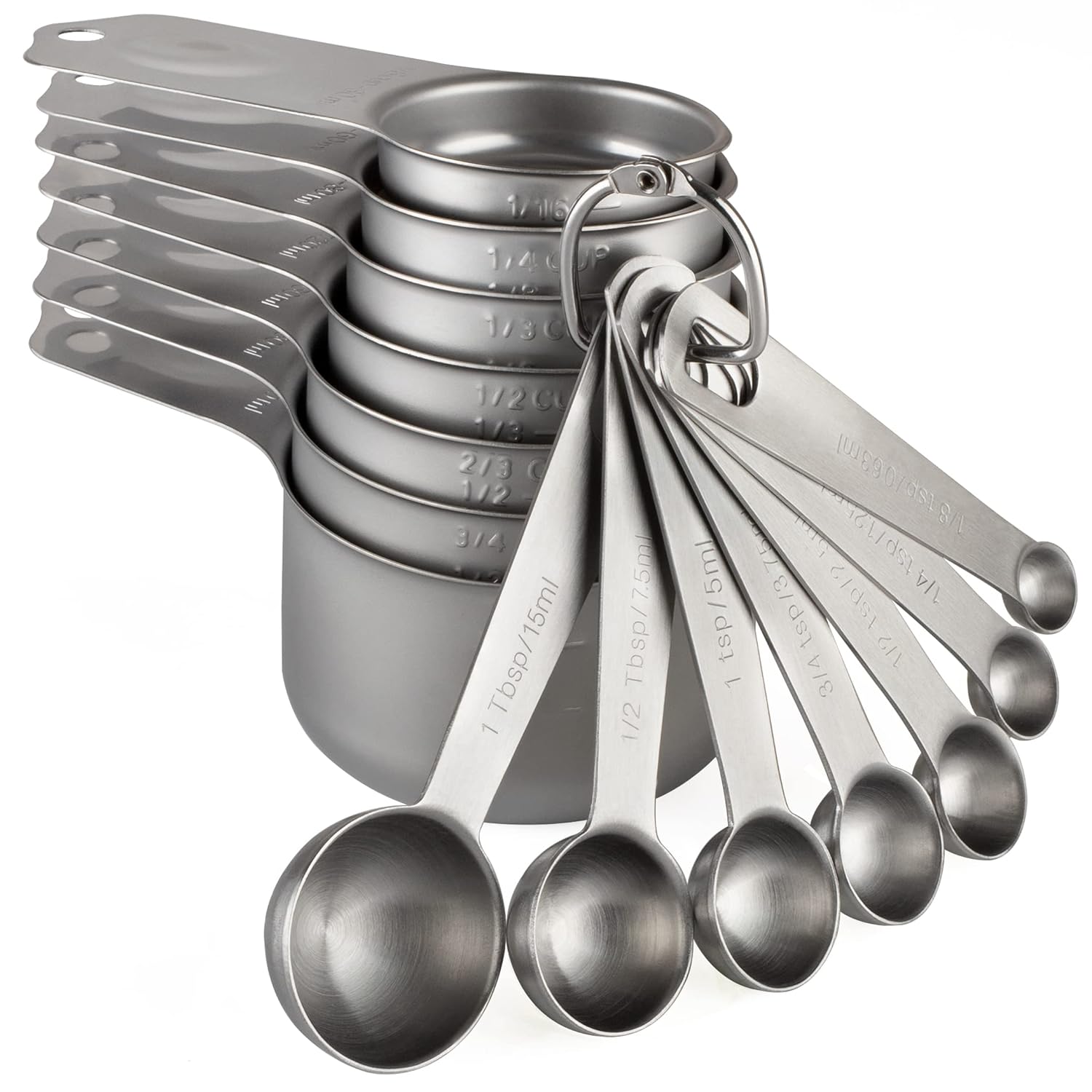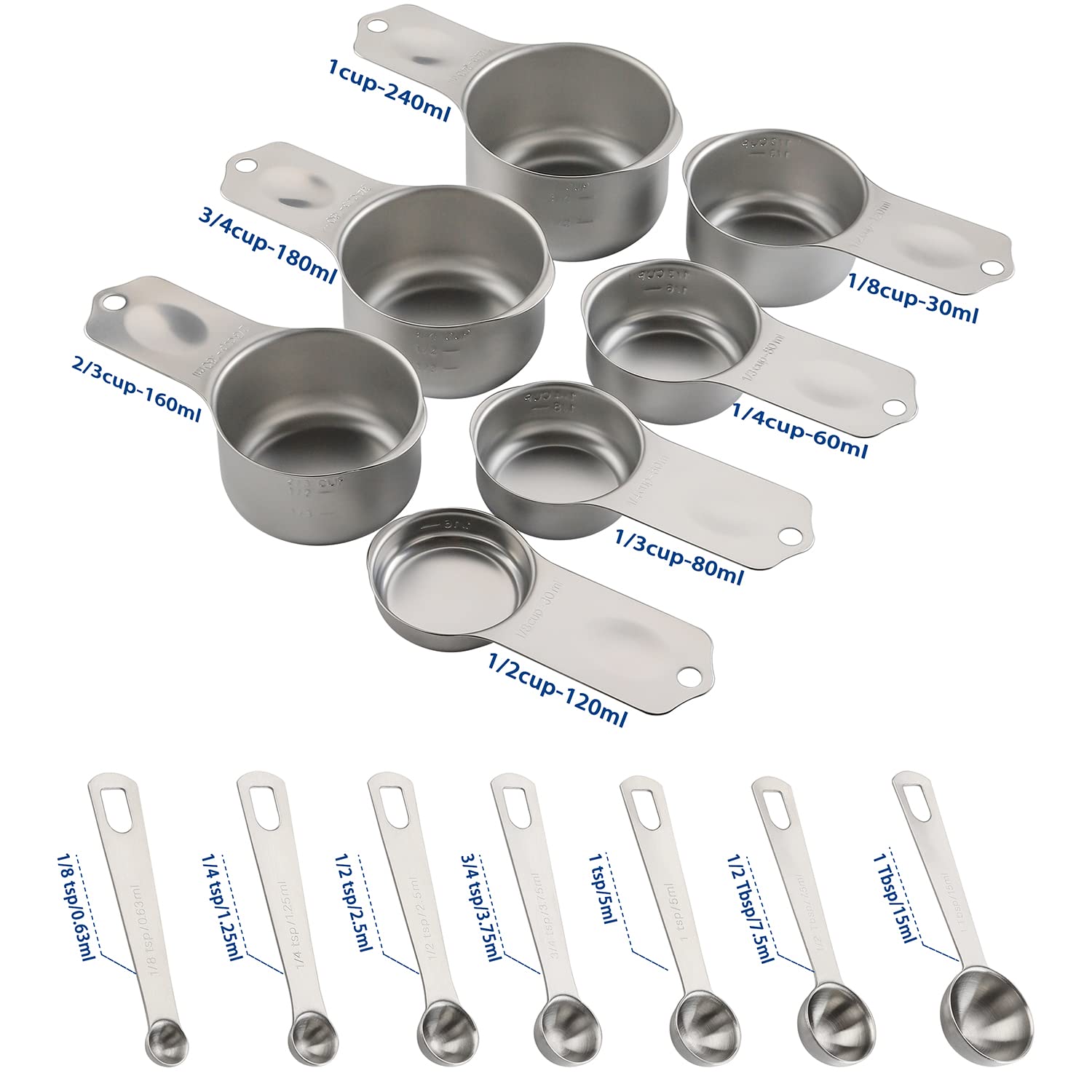 MEASURING CUPS AND SPOONS SET OF 14: This package includes 7 Measuring Cups (1/8 cup, 1/4 cup, 1/3 cup, 1/2 cup, 2/3 cup, 3/4 cup, 1 cup), 7 Measuring Spoons 1/8 tsp, 1/4 tsp, 1/2 tsp, 3/4 tsp, 1 Tsp, 1/2 Tbsp, 1 Tbsp, various sizes meet all your baking needs
