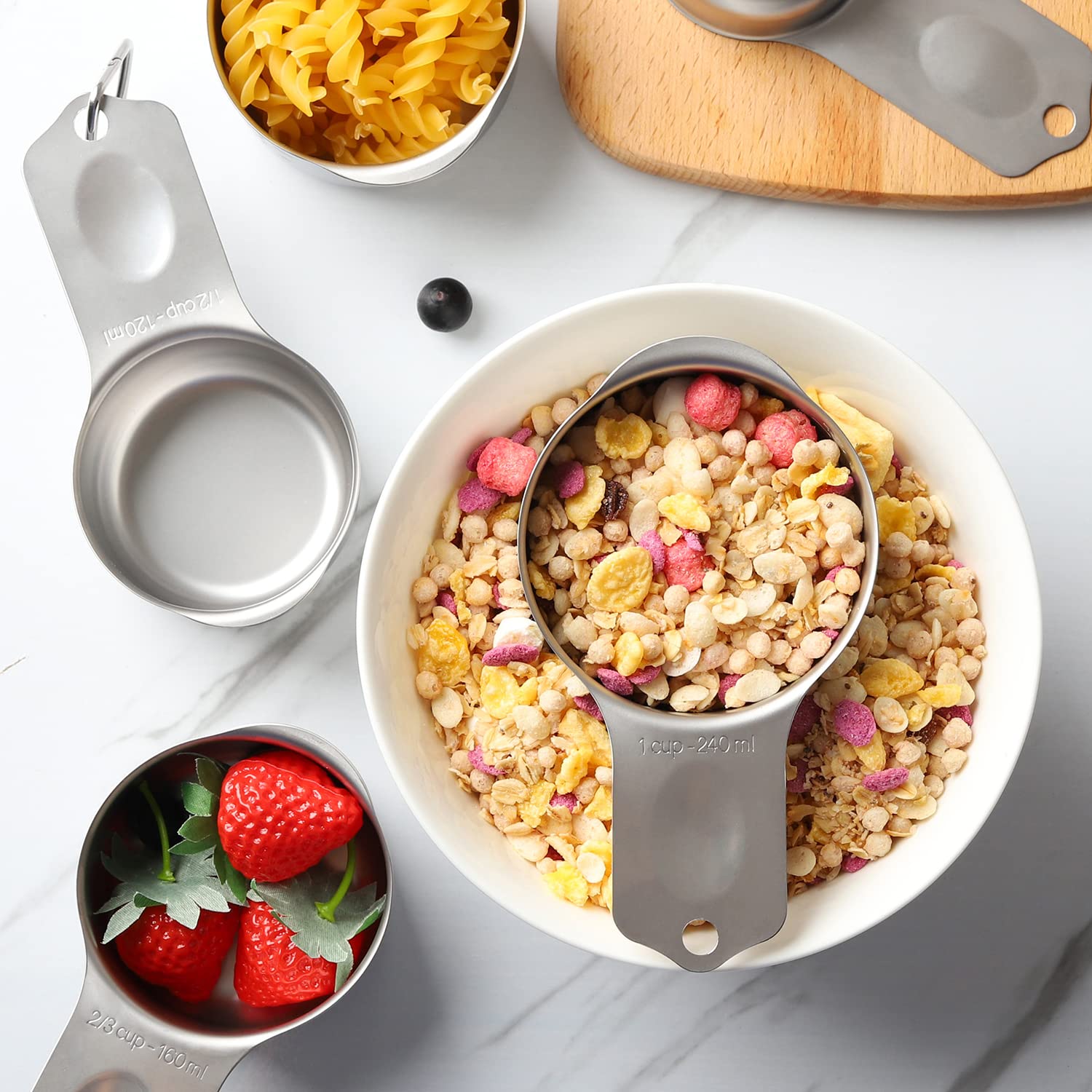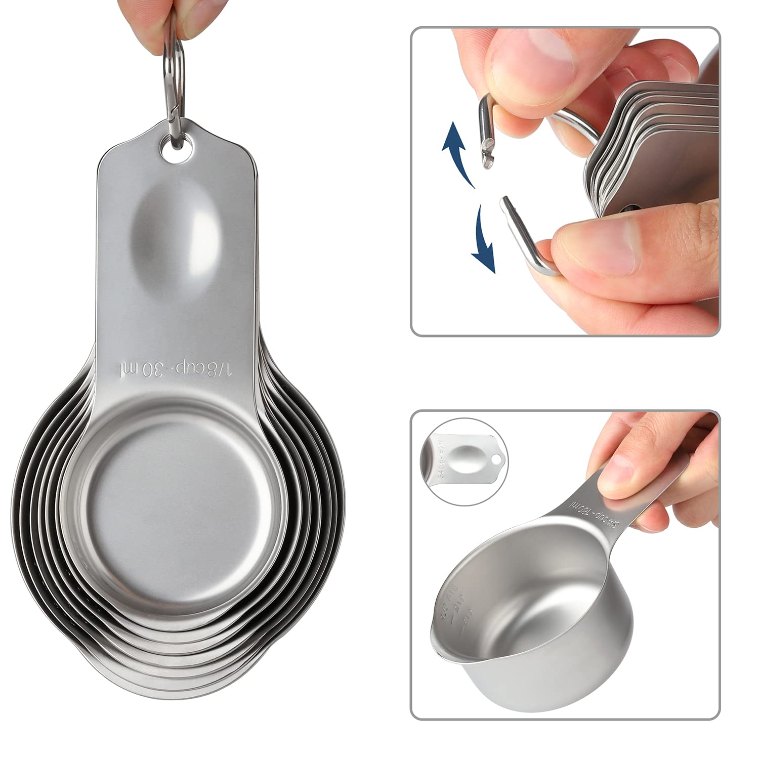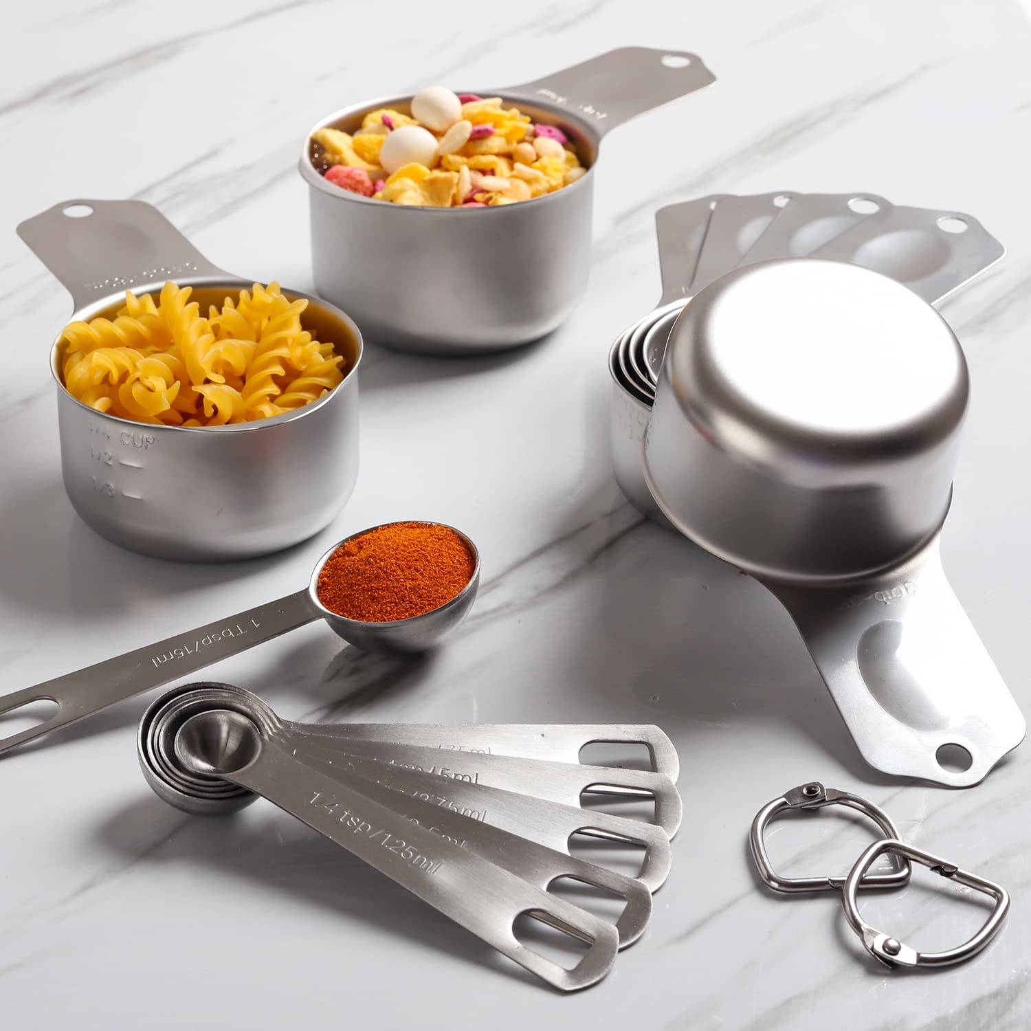 STACKEBLE TO SAVE STORE SPACE: Both the measuring cups and measuring spoons each stacked in one bundle by a D-shaped detachable ring, which helps to keep it together as a set after a full day of baking or cooking, nesting-spoons/cups for easy storage and space-saving. You can also throw them wash in the dishwasher for quick and easy cleanup.