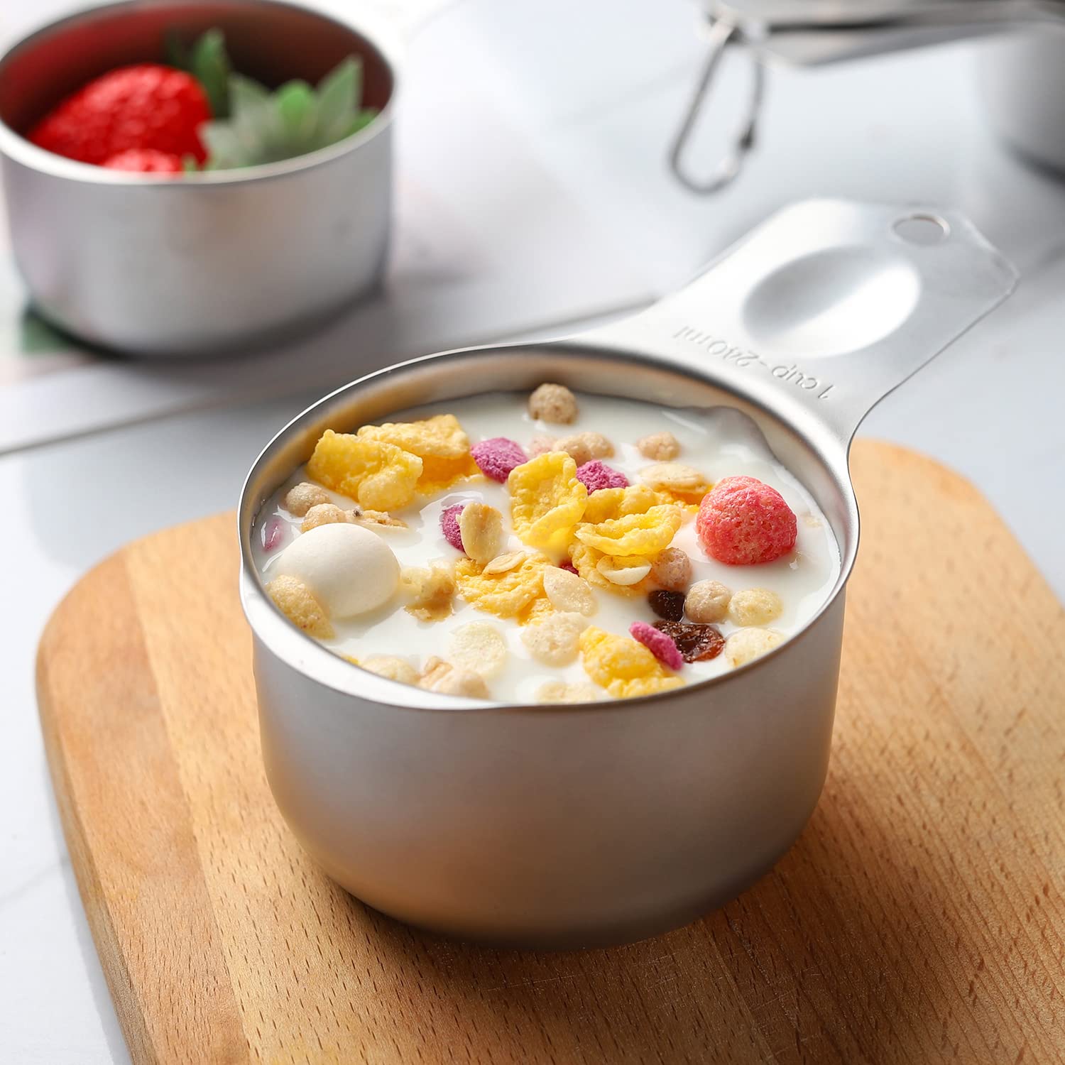 STAINLESS STEEL MEASURING CUPS AND SPOONS: Made of one piece polished well construction with smooth around, so there is no gaps for ingredients to get stuck, This measure set are made out of one piece of 18/8 stainless steel, so the cups and spoons handles will never breaking off or bending easily. You don’t need to be obsessed by stuck food in cracks, just put them into the dishwasher to have it easily cleaned.