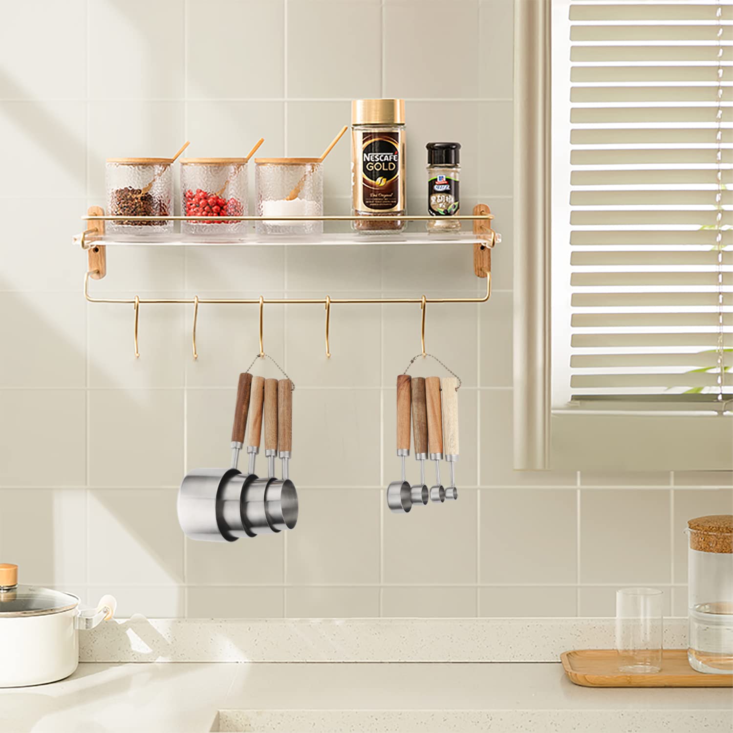 NON-SLIP WOODEN HANDLE: The handle of the measuring cup is made of solid wood, it has been carefully polished, the wood handle has an extremely comfortable feel and anti-slip property. The volume of each measuring cup is clearly engraved on the handle. The measuring cup handle has hanging holes for easy storage.