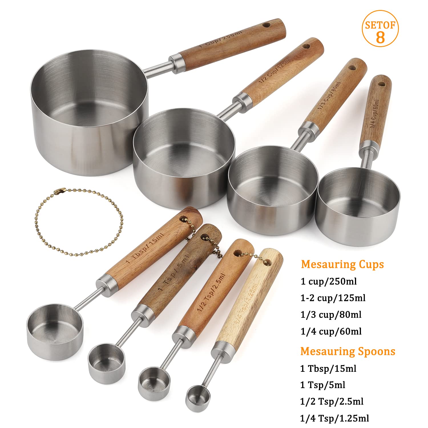 8 PIECES SET INCLUDED: This measuring set includes 4 size measuring cups: 1 CUP-250ML, 1/2 CUP-125ML, 1/3 CUP-80ML, 1/4 CUP-60ML. 4 Measuring spoons: 1tbsp-15ml, 1tsp-5ml, 1/2 tsp-2.5ml, 1/4 tsp-1.25ml. Ideal for measuring the right amount of solid and liquid ingredients such as flour, dry rations, salt, oil, milk, syrups. No matter you are a novice or an experienced cooker, this is a must-have kitchen tool.