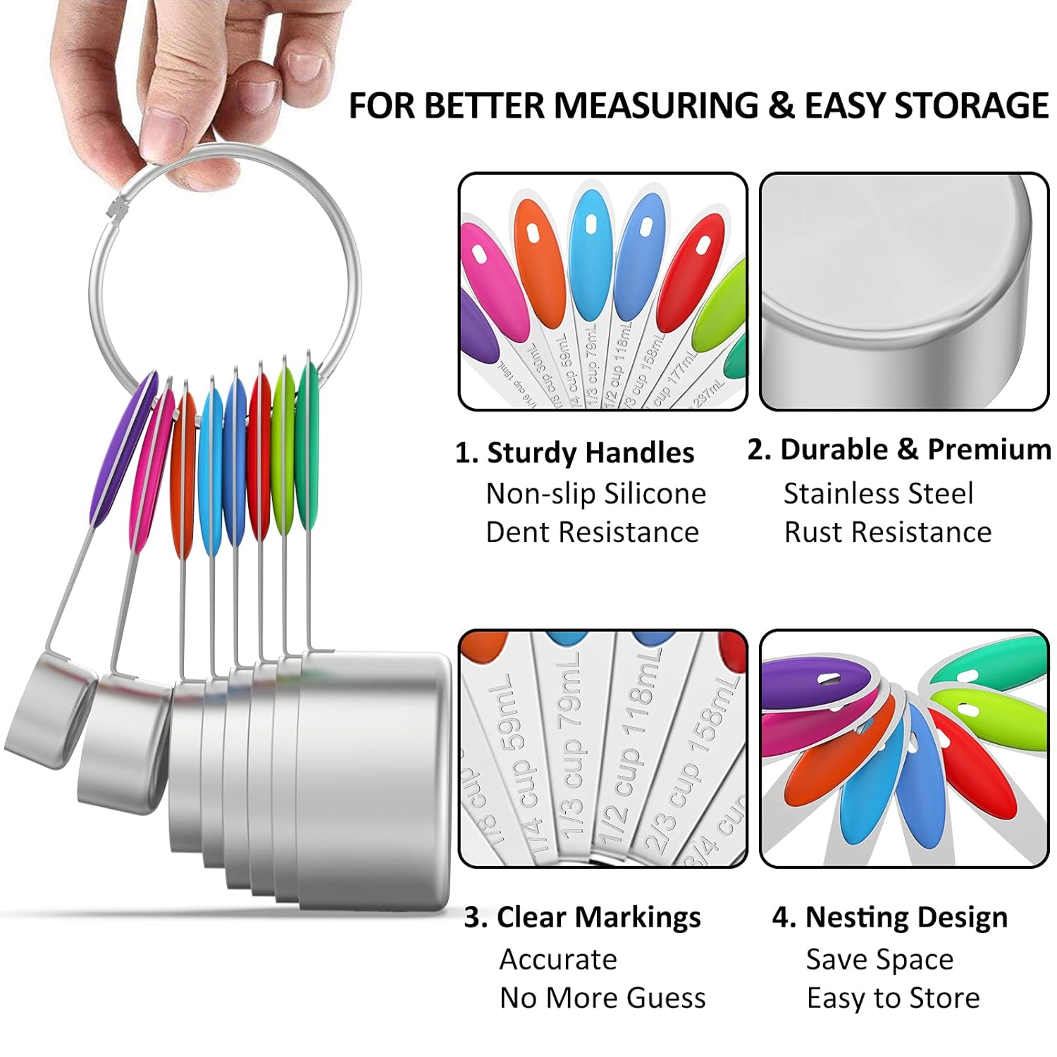 ENGRAVED MEASUREMENT: Each cup and spoon’s “ml” and cup sizes have passed clearly engraved marking, and you can quickly identify the cup scale according to the color of the handle. No more guess in kitchen!
