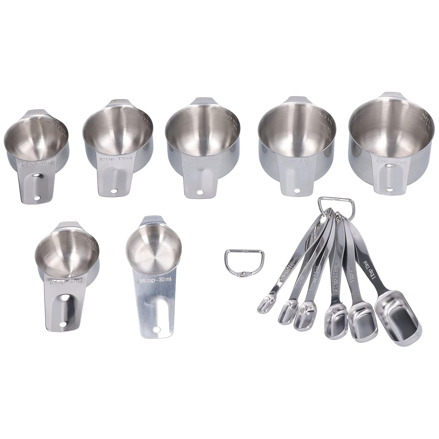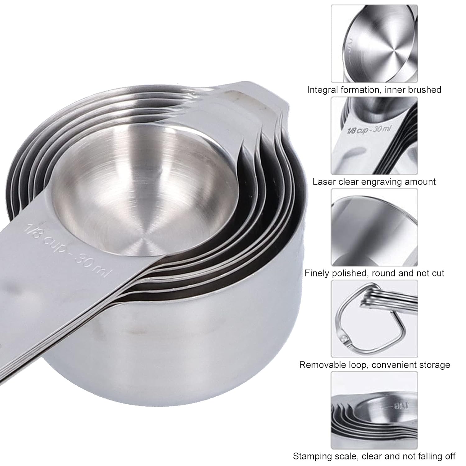 The features of these stainless steel measuring cups include increased stability, flat bottomed design, and a thick and sturdy handle that will not bend or break.