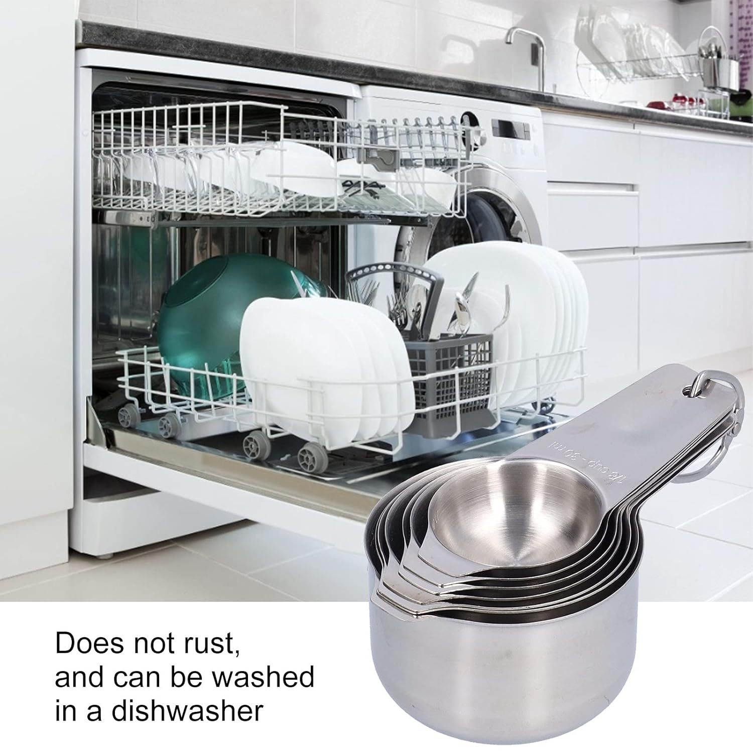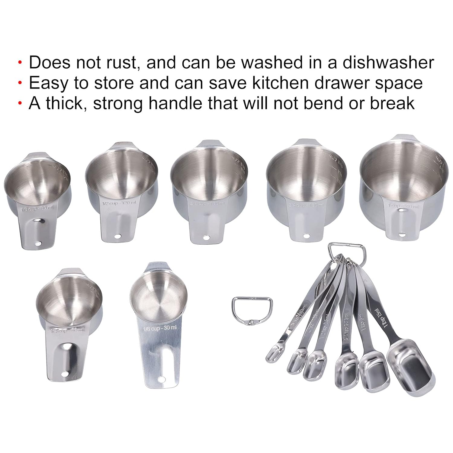 2. The features of these stainless steel measuring cups include increased stability, flat bottomed design, and a thick and sturdy handle that will not bend or break.