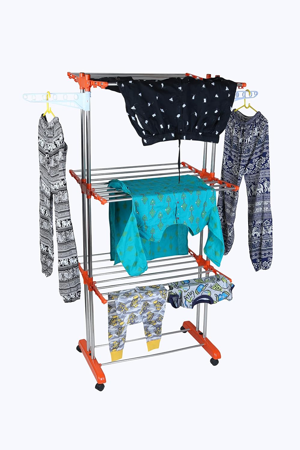 Made of high-quality stainless steel for durability Features 3 tiers of drying racks for ample hanging space and good air circulation Foldable design for easy storage and space-saving 4 wheels at the base for easy mobility from room to room