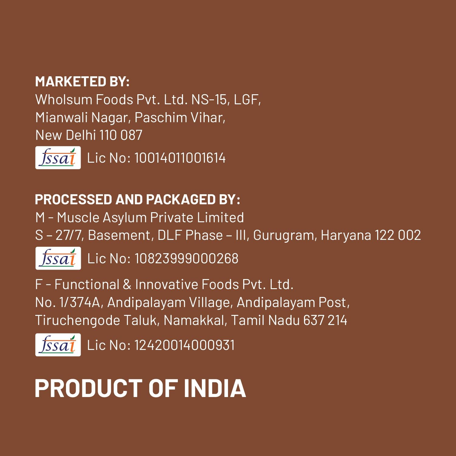 Packer ‏ : ‎ Functional & Innovative Foods FSSAI Lic No:12420014000934/ Muscle Asylum Pvt. Ltd No FSSAI: 10823999000268