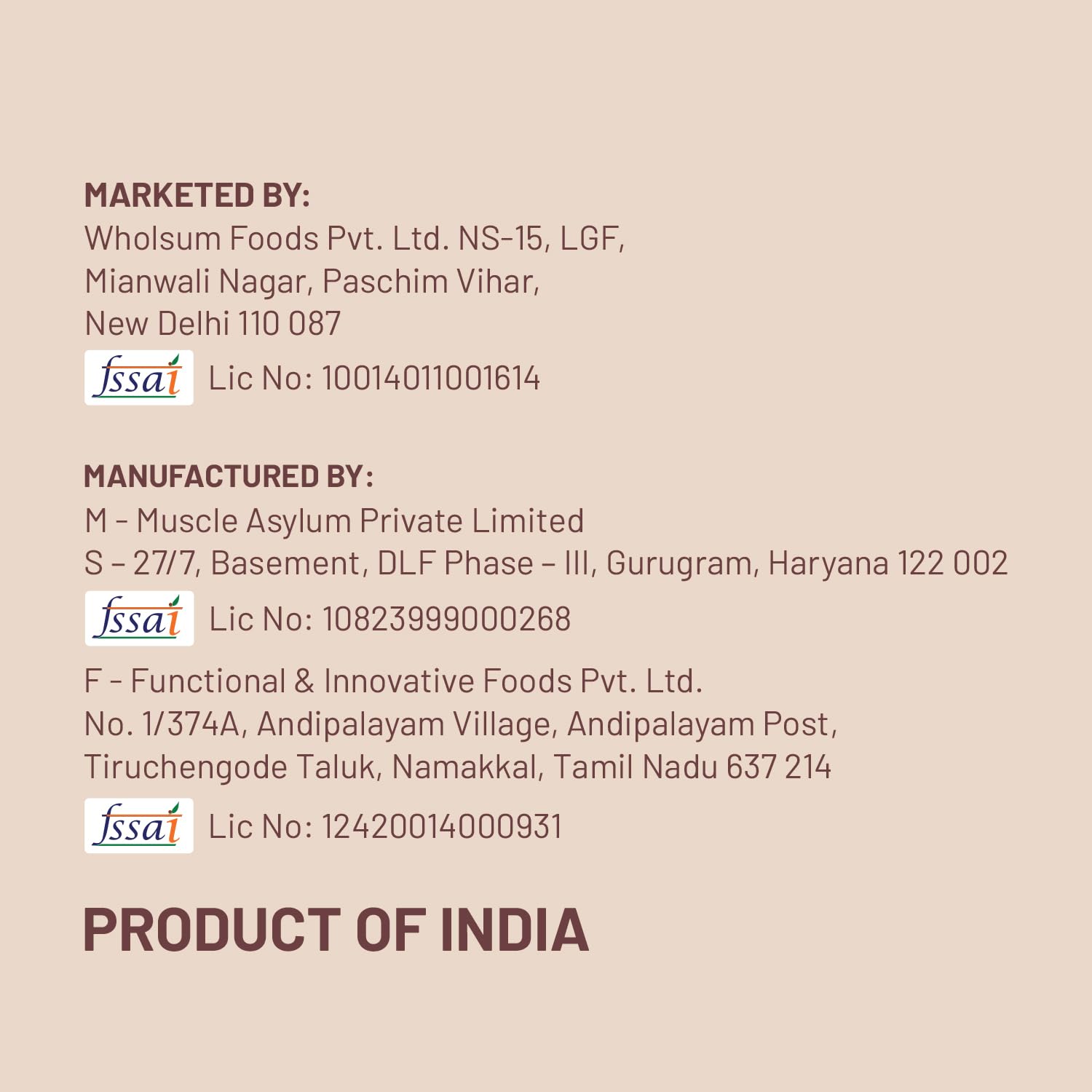 Manufacturer : Functional & Innovative Foods FSSAI Lic No:12420014000934/ Muscle Asylum Pvt. Ltd No FSSAI: 10823999000268, Functional & Innovative Foods Pvt. Ltd/ Muscle Asylum Pvt. Ltd
