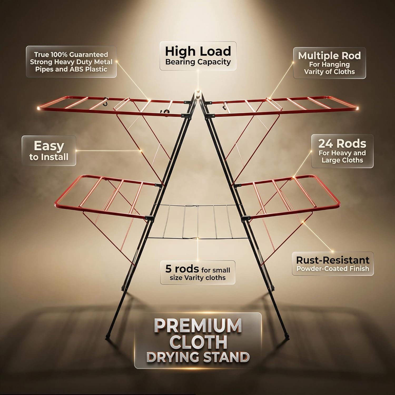 STRONG METAL CONSTRUCTION WITH STABLE DESIGN Made using heavy duty metal pipes and reinforced joints, this metal cloth drying stand provides excellent stability during use. The sturdy frame helps hold wet clothes evenly without bending, making it suitable for both indoor and outdoor drying.