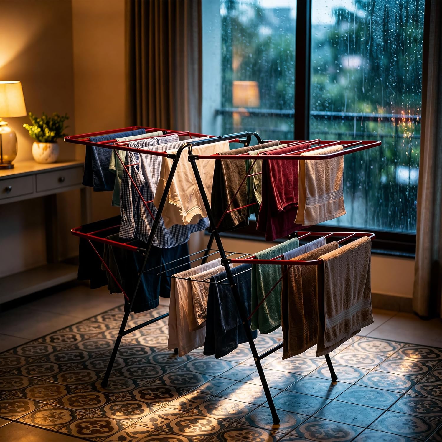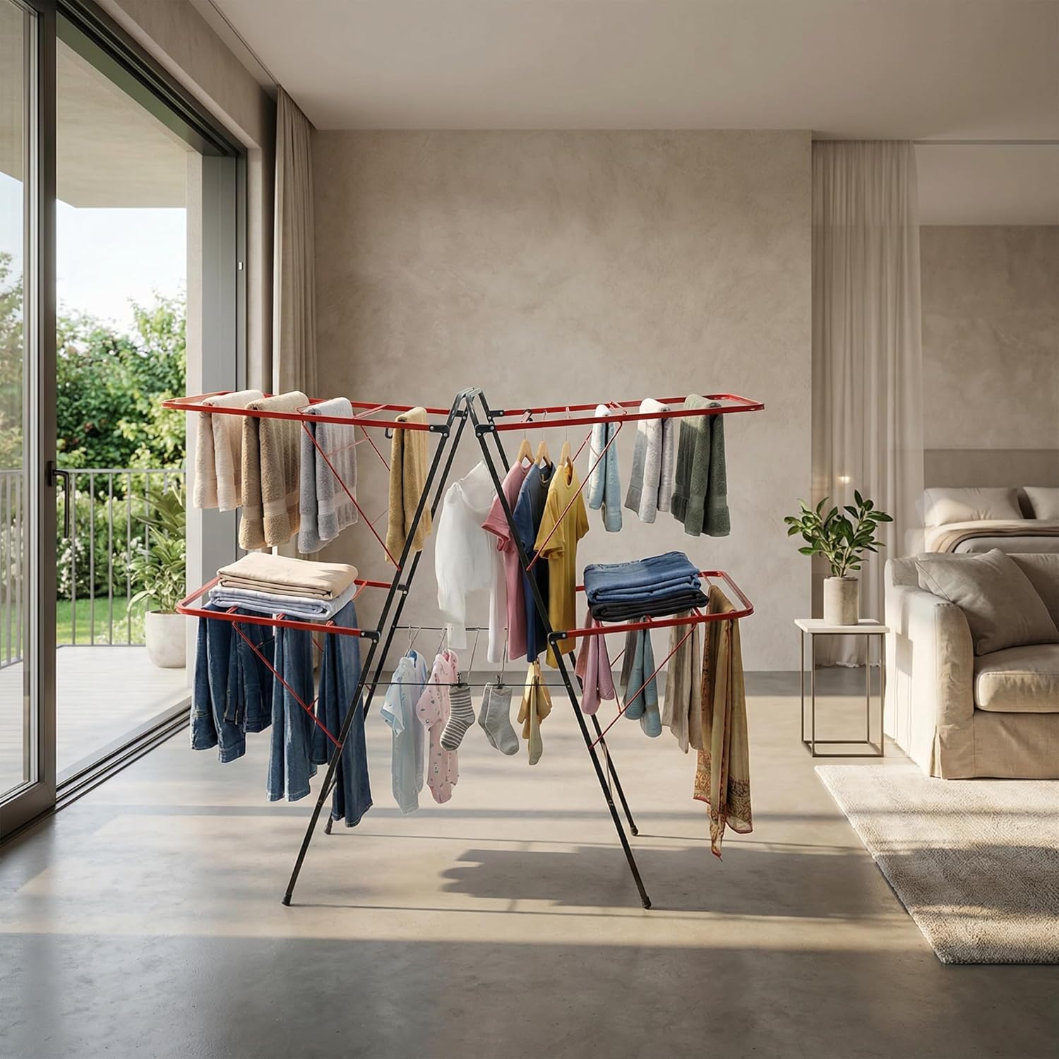 FOLDABLE, SPACE-SAVING CLOTH DRYING STAND The smart foldable design allows the clothes drying rack to be easily opened during use and folded flat when not in use. Ideal for compact spaces, it fits conveniently in corners, behind doors, or inside storage areas.