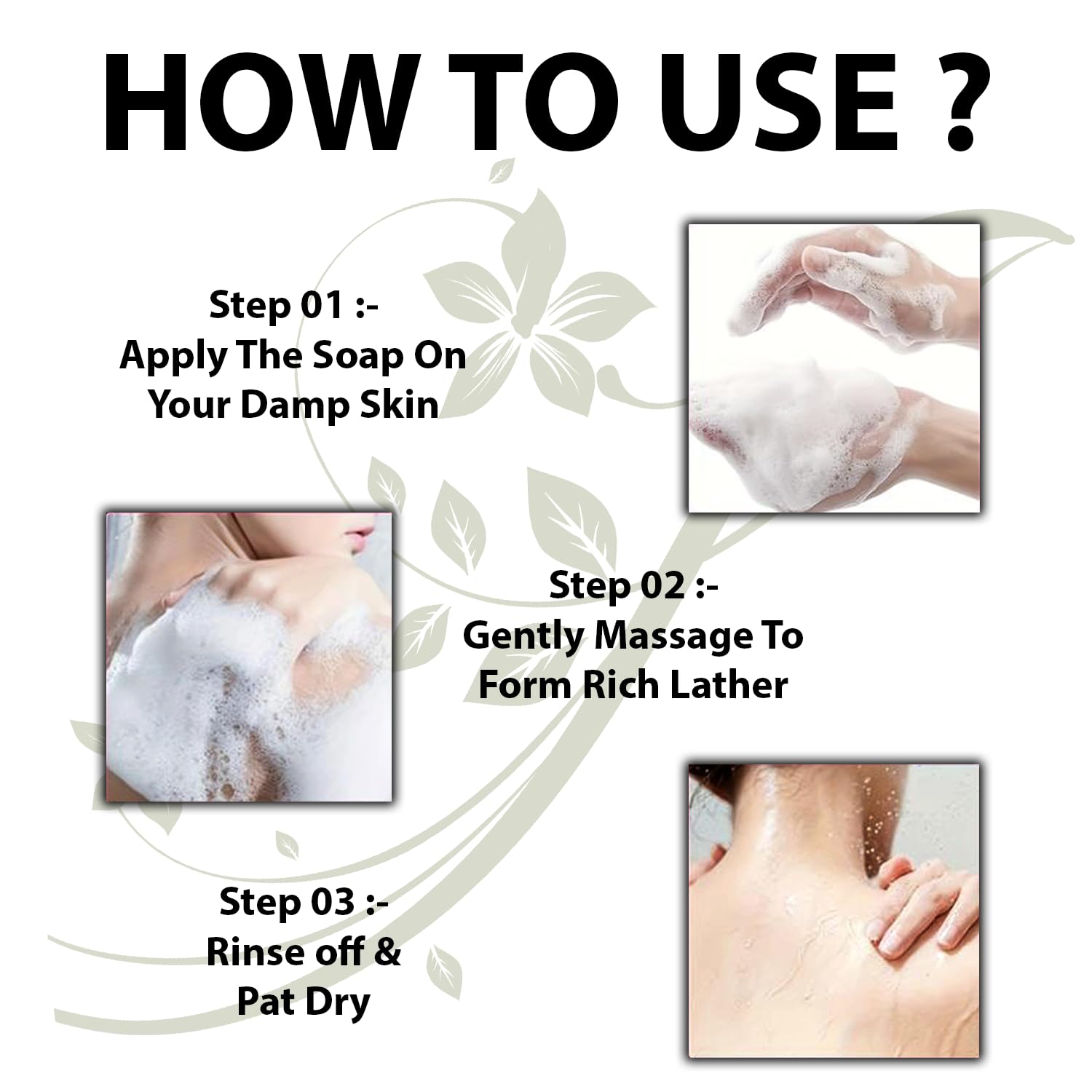 Wet your body and face with lukewarm water.Rub the soap between your hands or on a loofah to create a rich lather.Massage gently on your skin in circular motions.Rinse thoroughly with water.Pat dry and follow up with a moisturizer or body lotion.