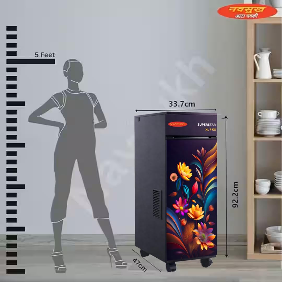 Introducing the NAVSUKH Superstar XL Flour Mill, a robust domestic flour grinding solution featuring a generous 7 KG hopper capacity. This powerful 750-watt machine comes equipped with premium stainless-steel grinders and metal chamber mouth, ensuring hygienic grinding of your grains. The mill’s thoughtful design includes a spacious container and complementary cover. With dimensions of 92.2 cm height, 33.7 cm width, and 47 cm depth, it fits conveniently in your kitchen space while offering substantial grinding capacity. The unit features ABFM technology and durable metal components, significantly reducing maintenance requirements. Operating on 220 volts, this automatic flour mill comes with essential accessories and is ideal for grinding various grains. The sleek silver finish and mobile design with wheels make it both attractive and practical. Regular cleaning after each use is recommended for optimal performance. This made-in-India appliance combines functionality with durability, making it a reliable choice for households seeking fresh, home-ground flour.