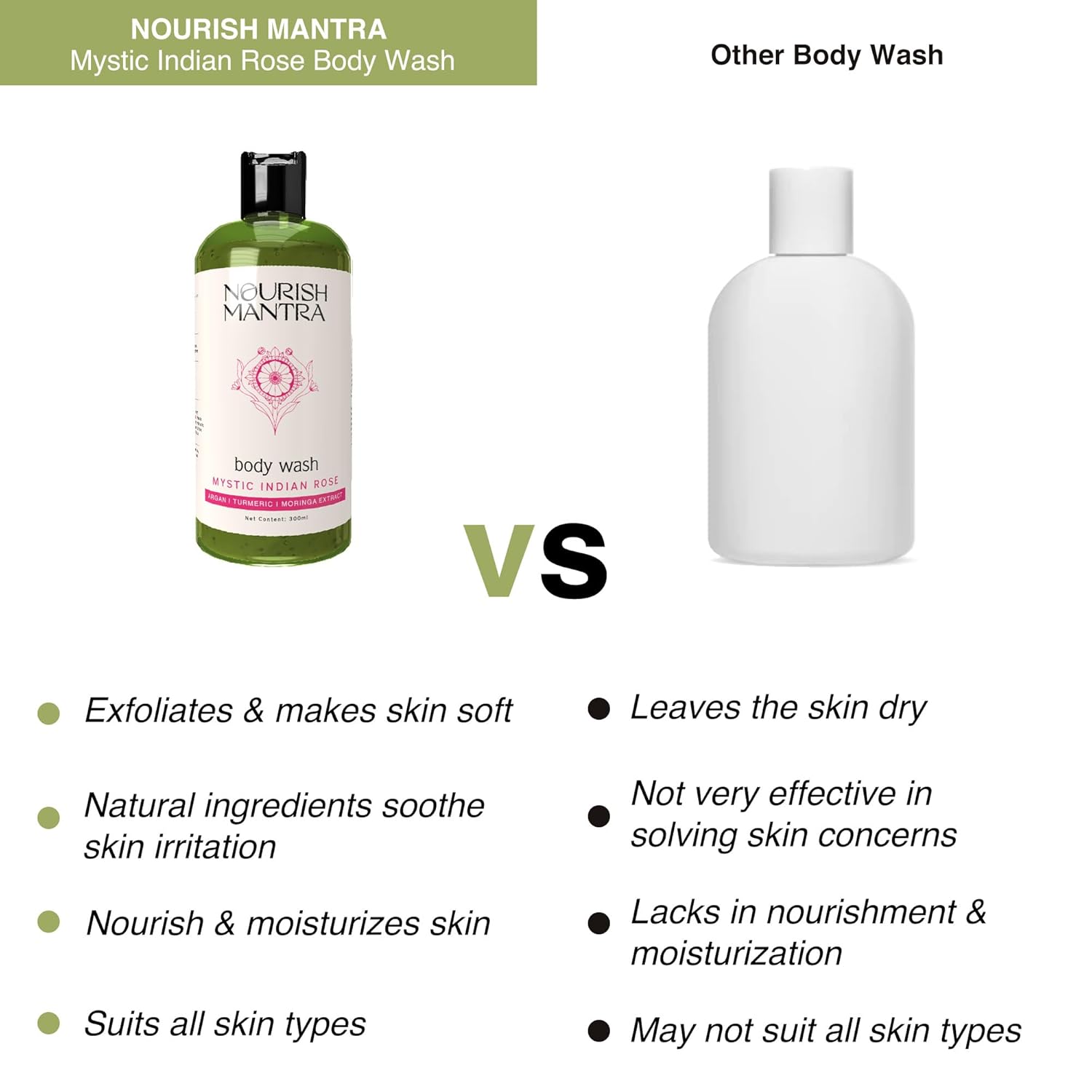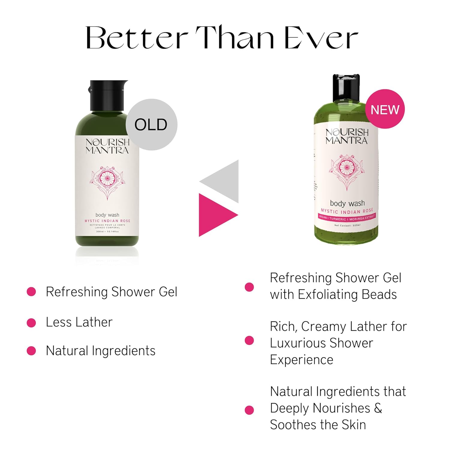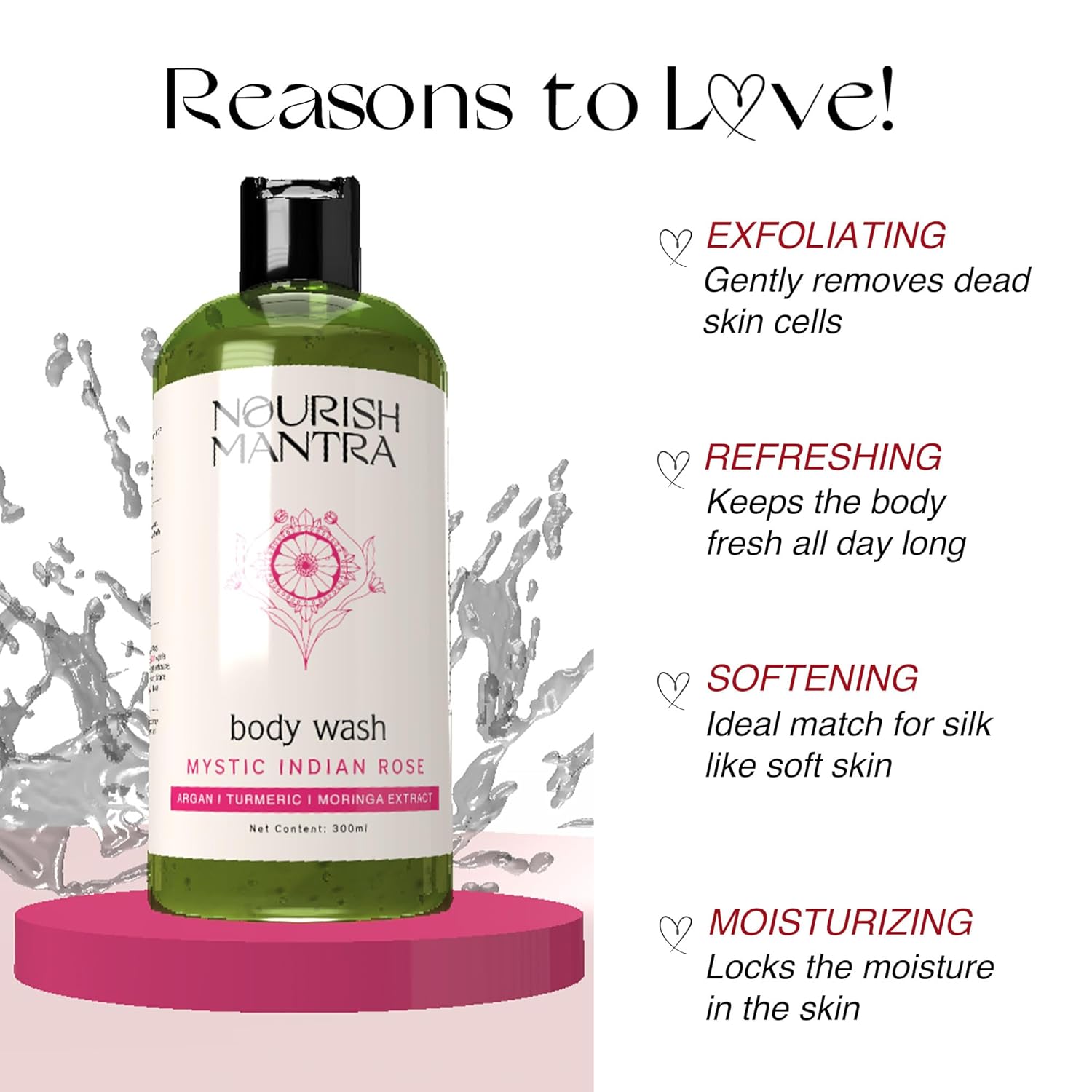 REFRESHED & SMOOTH SKIN: Experience the rejuvenating power of Nourish Mantra Mystic Indian Rose Body Wash. This body wash shower gel is enriched with Argan Oil, Moringa Extract, and gentle exfoliating beads, doubles as a body scrub, and cleanses your skin without stripping its natural oils, leaving it feeling refreshed and smooth.