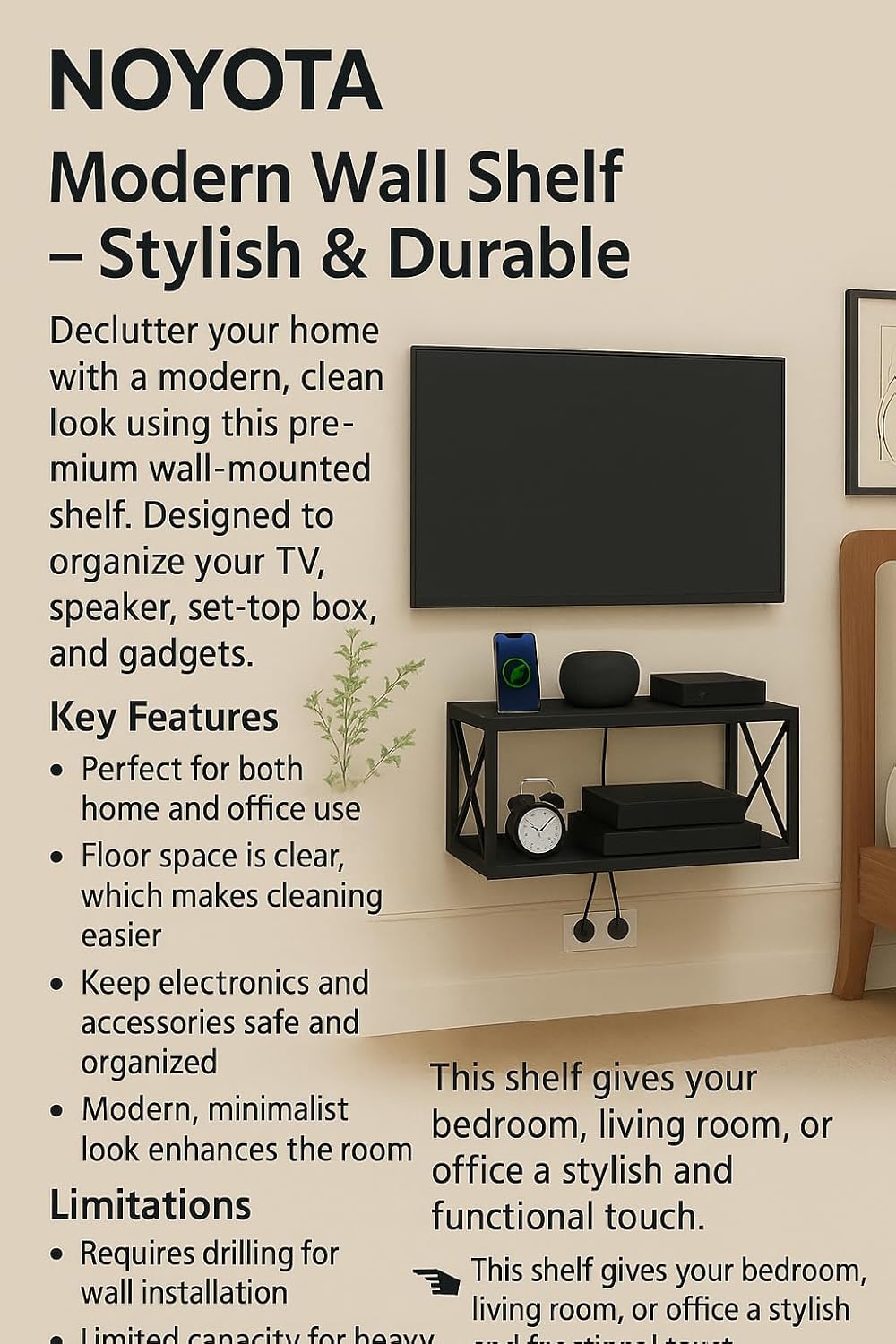 Wall T.V set up box stand Stylish Art Maker Present setup box is very decorative and attractive, Keep your set-top box firmly on this super stylish set-top box stand. The wall mount has been designed keeping in mind utility and aesthetics both. It has a sturdy yet stylish design, which enables you to keep your set-top box at its place on the wall and give your living room a pleasant look. It allows for better wire management and comes with a load-carrying capacity of up to 5kgs. In addition, the wall mount is easy to install. Load carrying capacity up to 5kg, easy to set up. TV Unit is design in a simple way to acclimatize your all necessary accessories such as set up box, Music system , speakers ,with remote organizer as well as decor.Easy to mount with all necessary hardware Included. Hardware is not visible when mounted Decorative and functional for your home dining room, living room, office, or drawing roomWall T.V set up box stand Stylish Art Maker Present setup box is very decorative