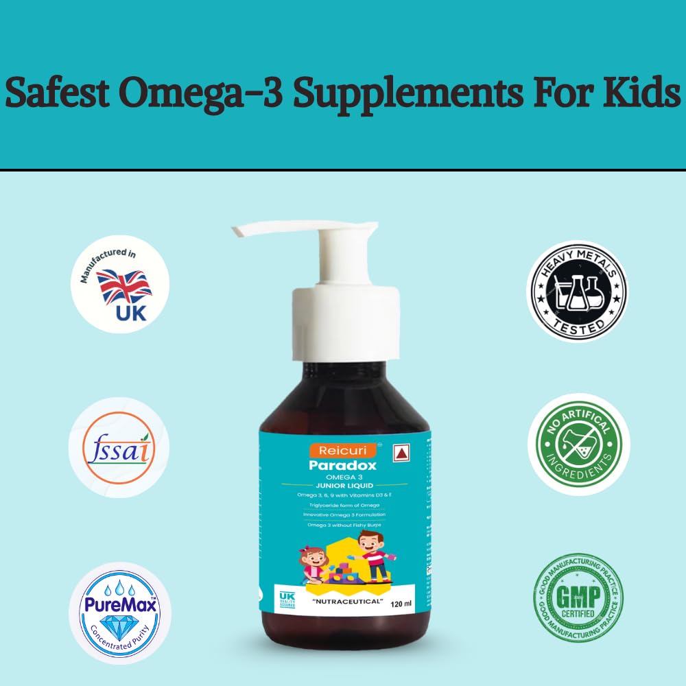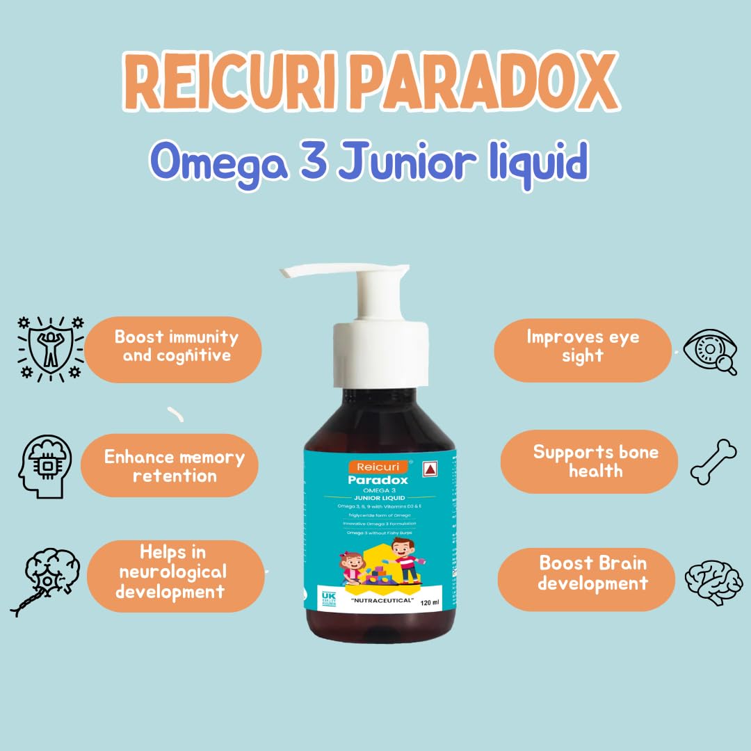 Scientists say that your kid’s brains are the most active and have the ability to develop a maximum of up to 18 years. Once they pass this age their brains don’t grow as much. EPA & DHA are key ingredients present in Omega that play a crucial part in developing a child’s brain, making them smart and sharp. Reicuri Paradox Omega 3 Liquid supplement for your kid with the optimum amount of EPA, DHA, Omega 3, 6, and 9.