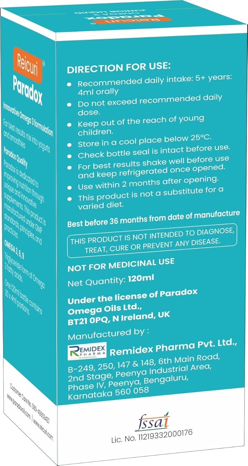 OMEGA 3 supplement liquid FOR KIDS: It has the optimum amount of EPA and DHA together with Omega 3,6, 9 essential fatty acids for their healthy neurological, heart and overall development. OMEGA SUPPLEMENT FOR YOUR CHILD: It is made from Icelandic salmon fish oil extracted with the help of Olive Oil and Lemon Oil having Omega, in a stabilised triglyceride form. STABLE OMEGA: Triglyceride form of Omega is the form of Omega as it exists, in fish. It is stable. Our product delivers Omega in this form. Hence we call it- Total Omega Concept. Ethyl Alcohol can also be used to extract fish oil. In this form the Omega is unstable. The alcohol and unstable Omega damages your child’s liver and heart. OMEGA IS EASILY ABSORBED BY YOUR CHILD’S BODY: Triglyceride form of Omega in Reicuri Pardox Omega Liquid Junior is easily absorbed by the body without leaving any harmful residues. ONE OMEGA, MANY BENEFITS: It protects the heart, boosts brain development, improves memory and focus, strengthens muscle, bones, skin, hair and nails. ADDITIONAL BENEFITS FROM OLIVE OIL AND LEMON OIL: The Vitamin E from Olive Oil and Vitamin C from Lemon Oil toughens the immune system of your child. PURITY: Mercury free, lead free and free from other marine impurities, Non GMO, and Gluten free. You can rest assured when you are giving it to your child.