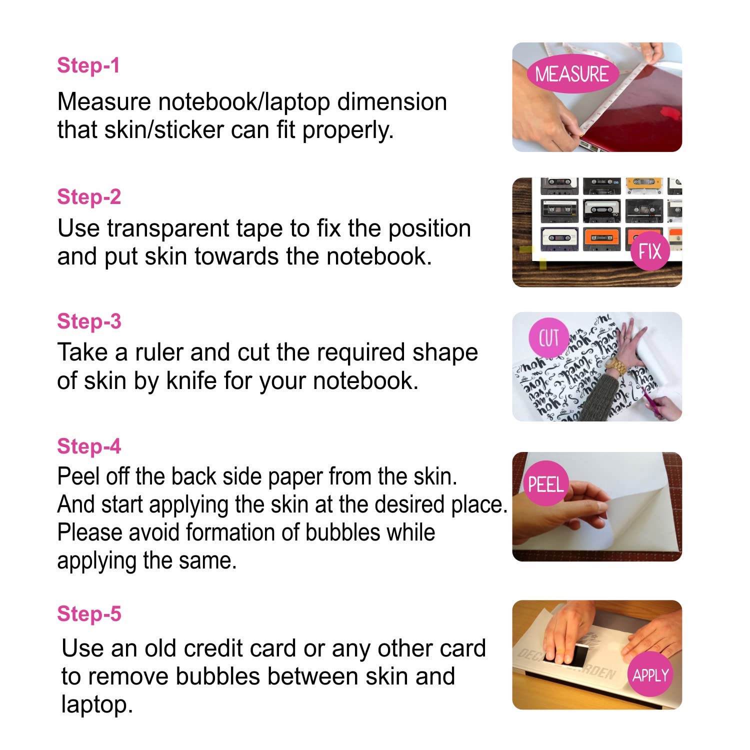 INSTALLATION: Measure correctly all the sides and take a pencil and mark properly in the backside of laptop skin where you can easily cut the skin with scissors. And, then you have to cut it properly. Clean laptop top with the damp cloth & again cleaning with the other tissue paper. Apply the skin slowly starting from one corner, use a credit card with cloth to press the skin properly. In case of bubble, gently pich it with a pin to release air.