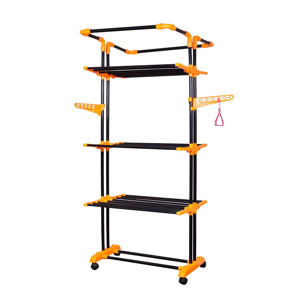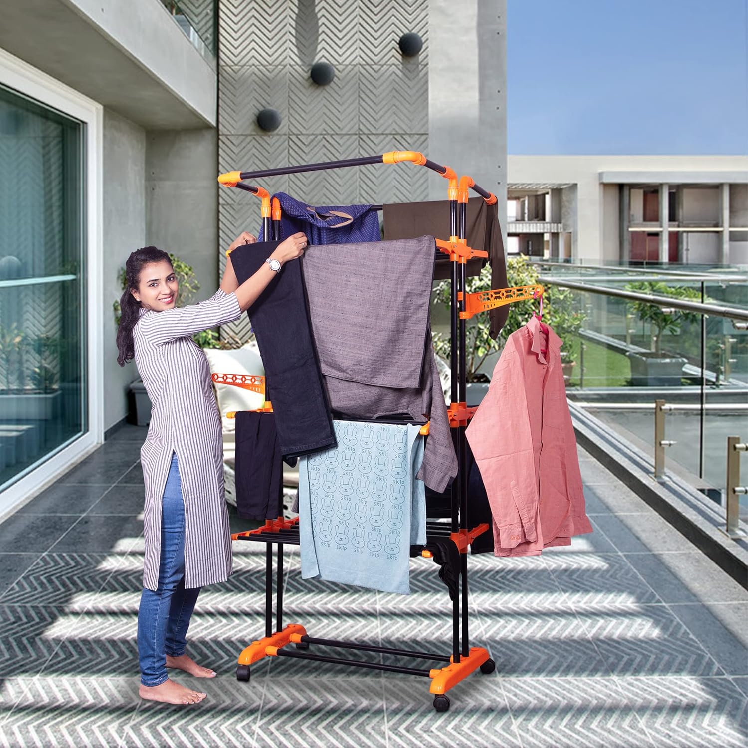 Wheels at the bottom for moving the rack conveniently. Hi-quality and durable Steel rails can take weight of heavy wet clothes. Folds Down for Easy Storage.