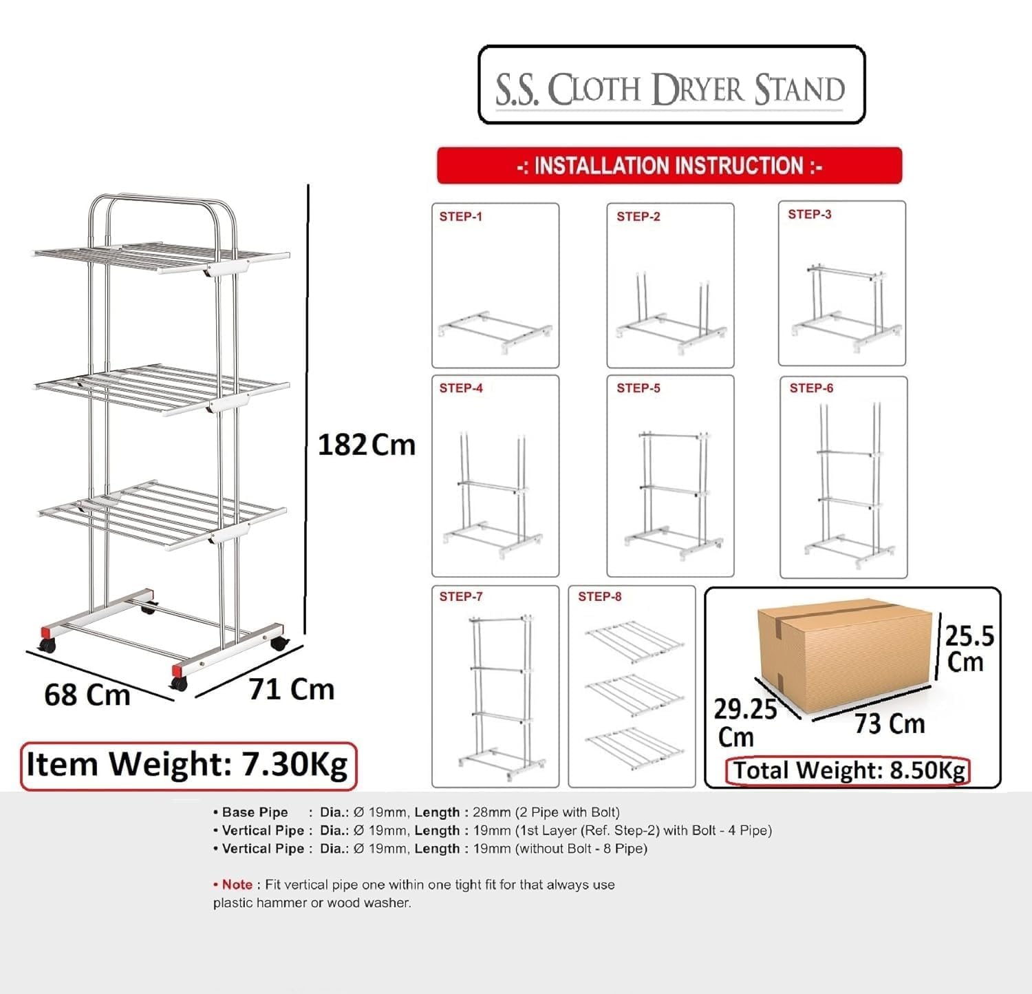 The Penora Cloth Drying Stand, proudly crafted in India, is designed using top-quality stainless steel and durable ensuring exceptional durability and performance for all your laundry drying needs. Unlike standard drying racks made from powder-coated iron, this clothes stand for drying foldable is built with heavy-duty stainless steel rods, supporting up to 50 kg of wet clothes. It offers strength, stability, and long-lasting performance, making it a reliable choice for families. With 58 feet of drying space, this 3-layered cloth drying stand features 6 foldable wings, 24 sturdy rods, and 14 hanger holes, providing ample drying space and optimal air circulation. Its collapsible and space-saving design makes it ideal for small living areas, while the 360-degree castor wheels with locking mechanism allow for easy mobility indoors and outdoors, keeping it stable even on breezy days. This clothes drying stand wall mounted or freestanding unit is hygienic and functional, eliminating the need for makeshift drying solutions like ropes and nails. Whether used as a balcony cloth hanger for drying, a stand for cloth hanging, or a dry clothes stand for balcony, it ensures quick and effective drying for all types of clothing. Constructed with rust-resistant stainless steel rods and robust ABS plastic components, this clothes drying stand for balcony is weather-resistant and pet-friendly, making it perfect for daily use. The foldable drying rack for clothes is easy to assemble, and its sturdy build ensures long-lasting performance. Enjoy peace of mind with our 1-year Brand Trust Warranty against manufacturing defects. We prioritize transparency and customer satisfaction, delivering exactly what you see in the product images. For any assistance, our dedicated customer service team is available Monday to Saturday from 9:30 AM to 6:30 PM (excluding national holidays).