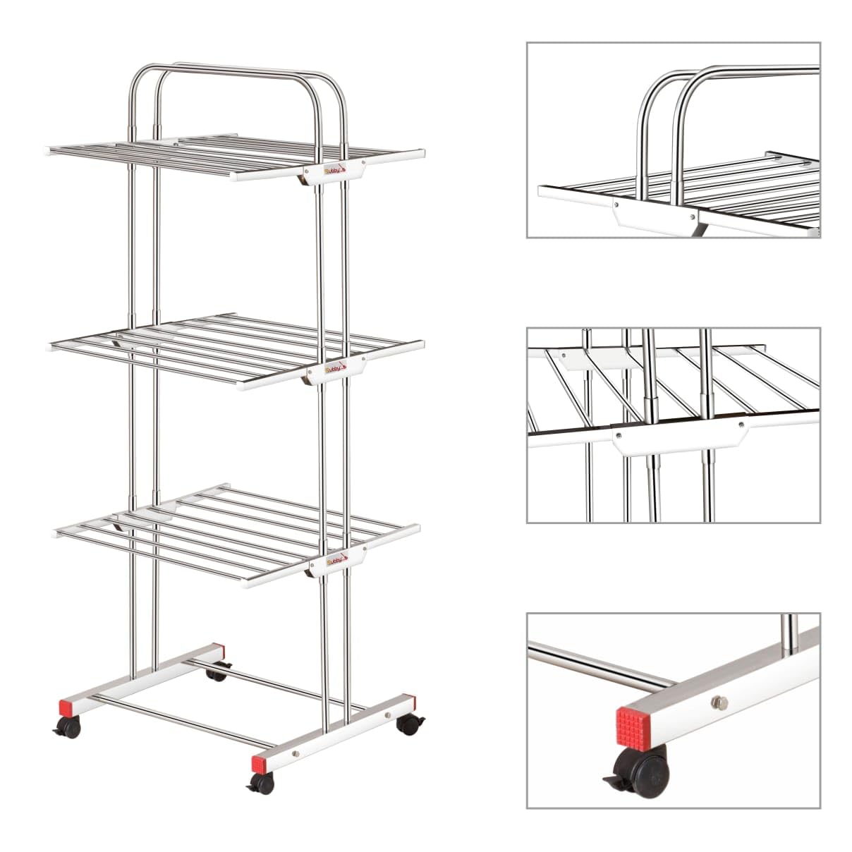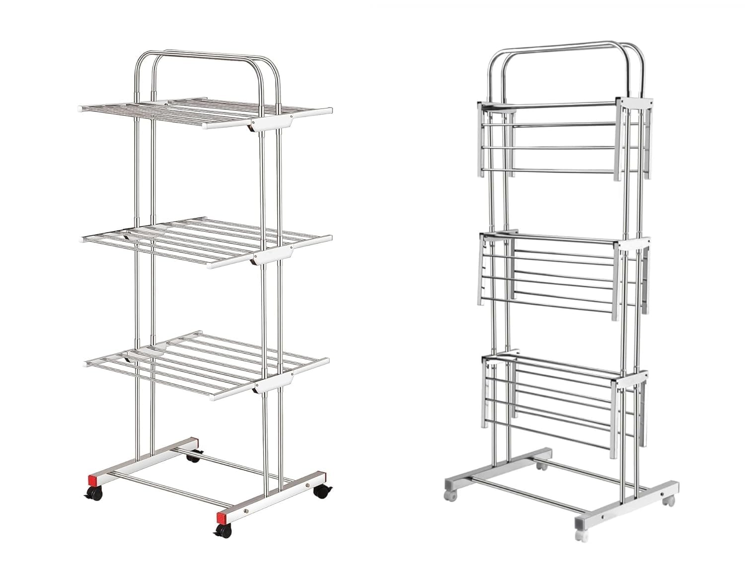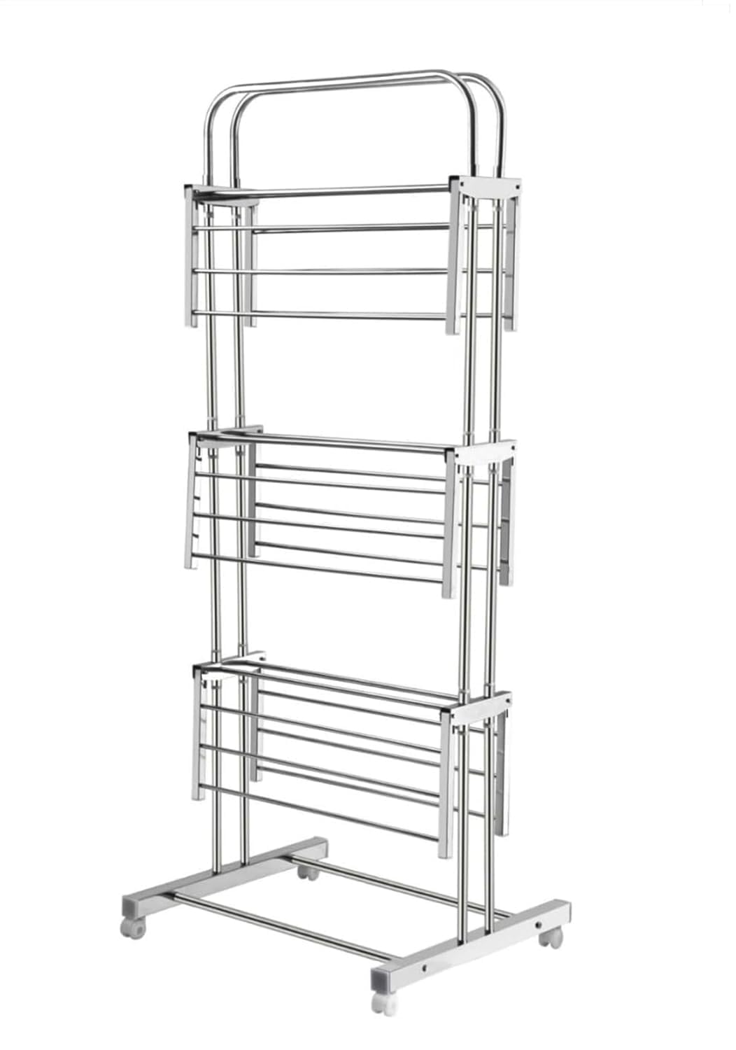 Premium Quality & Heavy-Duty Design: The clothes stand for drying is built with stainless steel rods, ensuring durability, rust resistance, and stability. Unlike powder-coated iron racks, this cloth drying stand supports up to 50 kg of wet clothes.