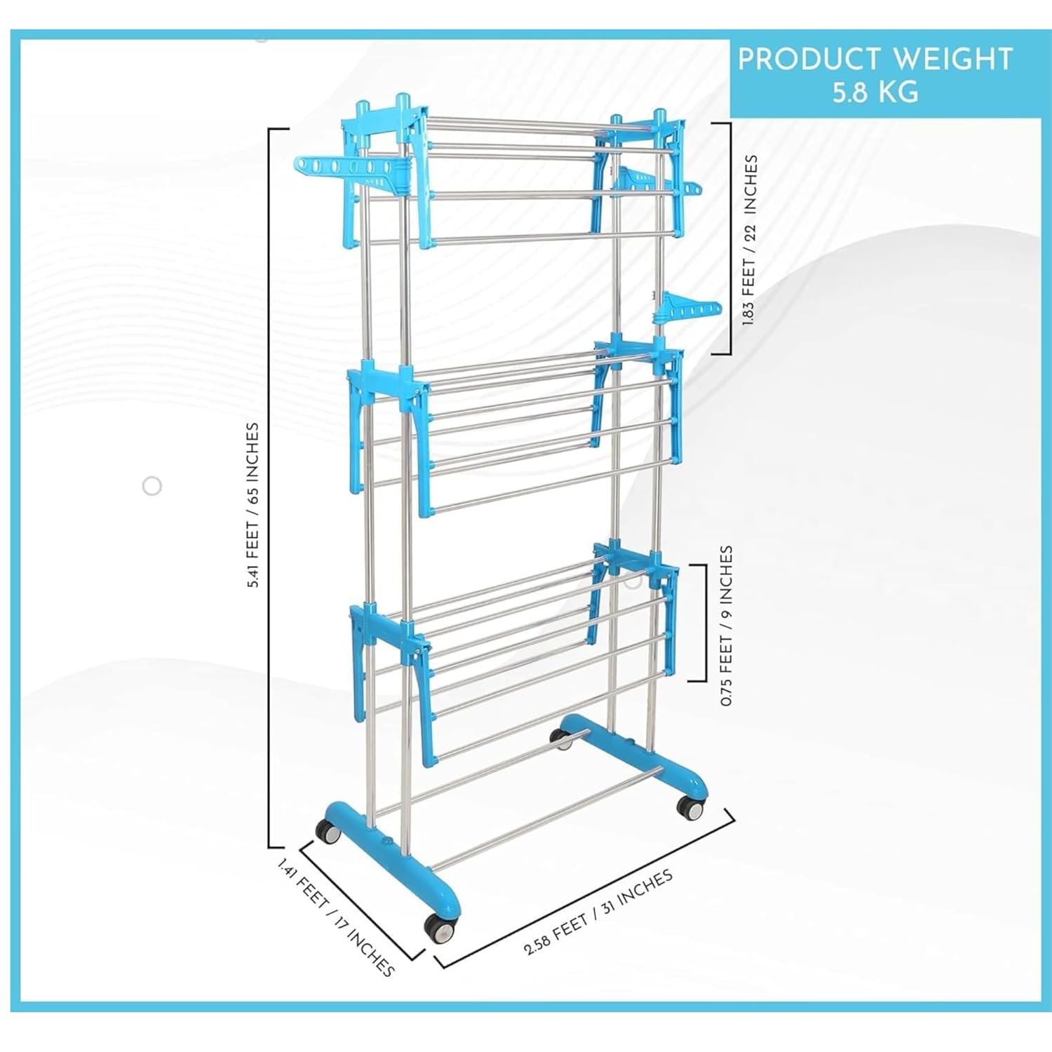 ABOUT SPACE 6 ft Clothes Drying Stand – 3 Layer Foldable Cloth Dryer Stand, Portable with Castor Wheels, 24 Hanger Rods & 2 Wings – Anti Rust Steel Double Pole (Blue – L 75 x B 50 x H 168 cm)