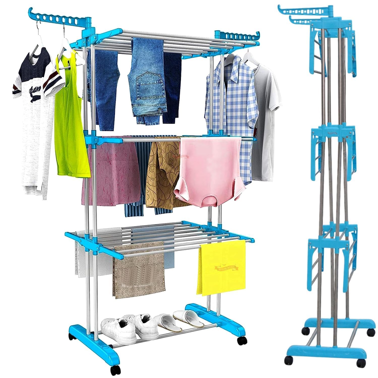 Clothes Drying Stand – 3 Layer Foldable Cloth Dryer Stand with Stainless Steel Rods, Portable with Smooth Wheels, Foldable Wings & Strong Frame (Blue)